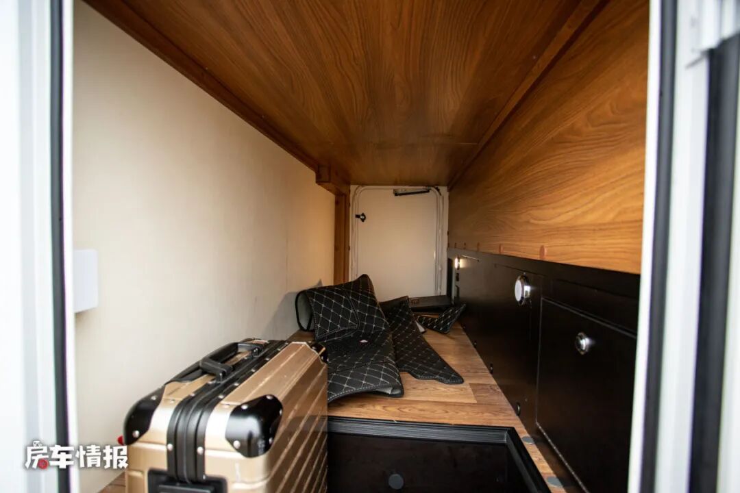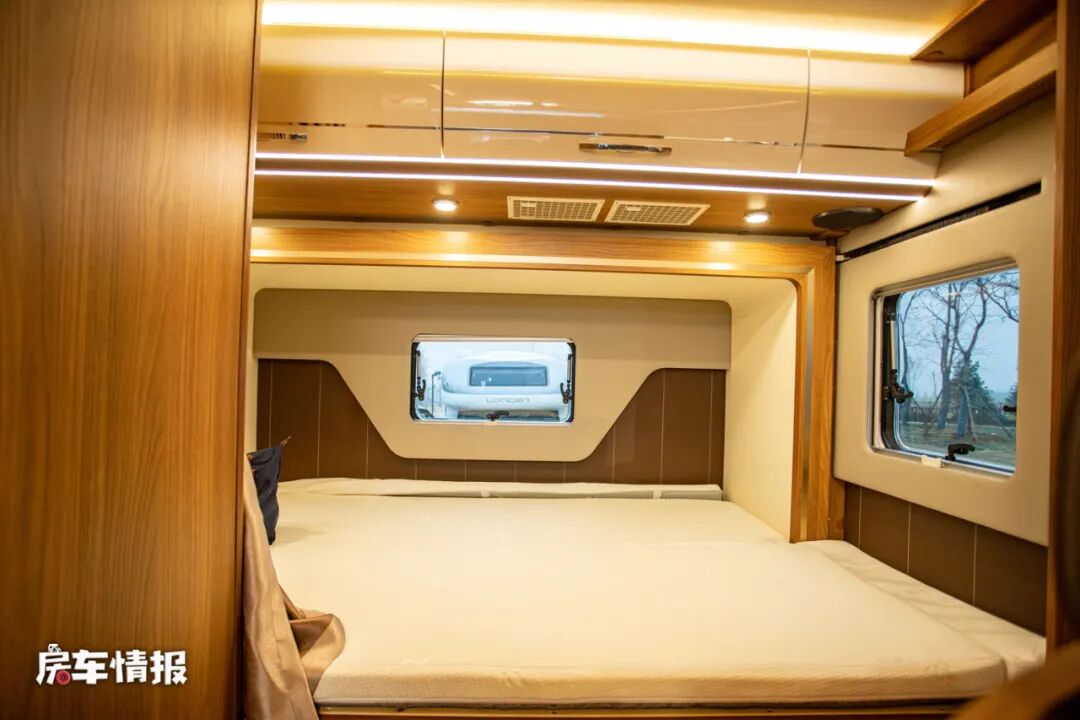 位于车厢最尾处的是整车的休息区,采用了横置床的设计,整体尺寸是1930*1360mm,能够满足日常两个人的使用,顶部也配置了基础的吊柜,以满足日常衣物的存放。