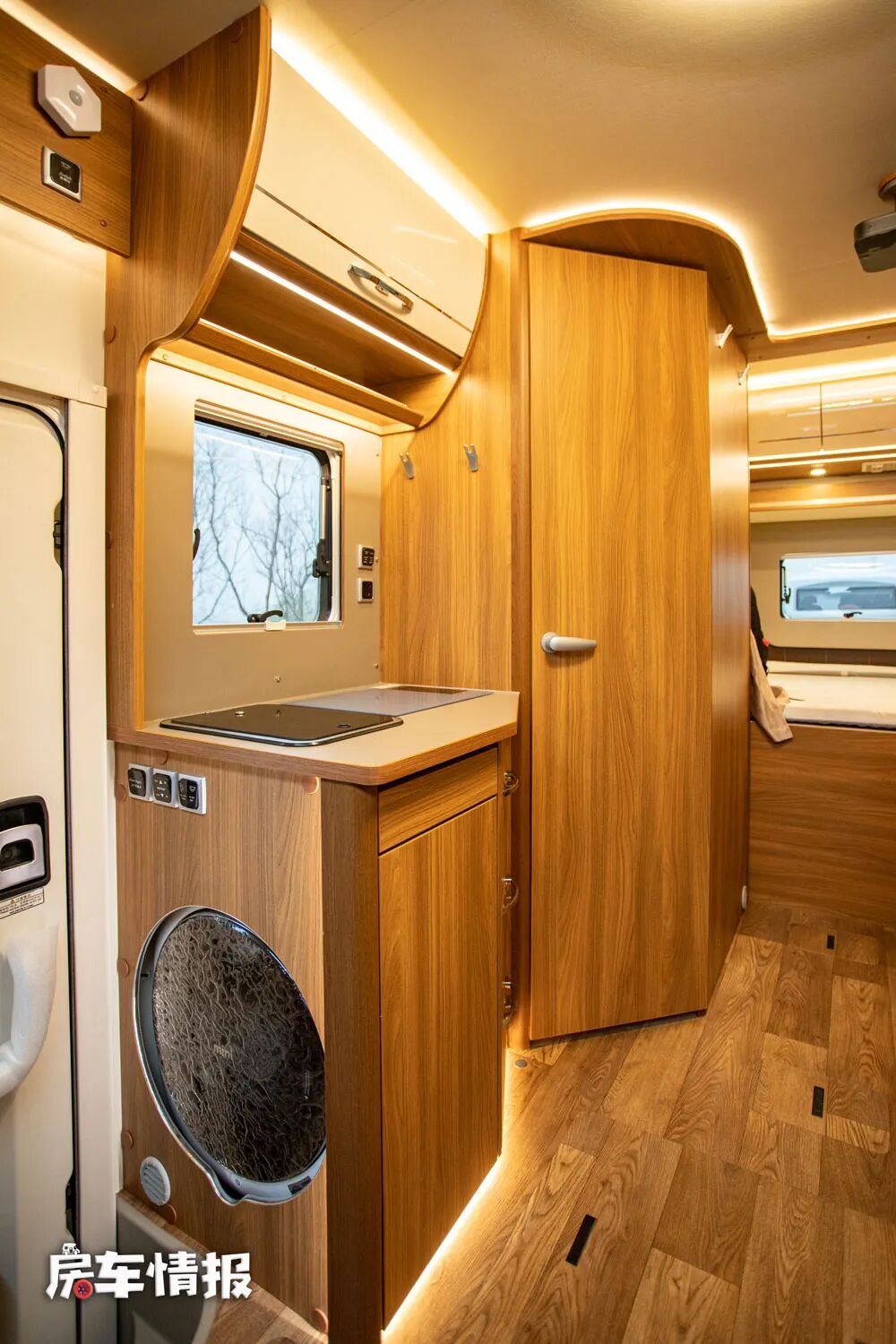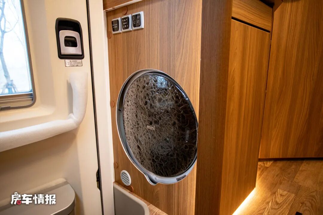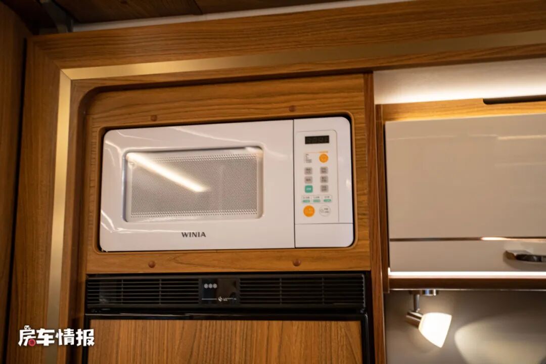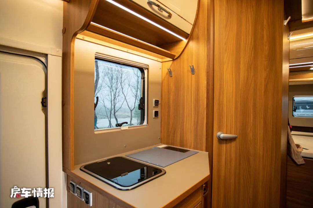 整辆车的厨房区域并不是很大,只能说表现的中规中矩,但好在配置了较为齐全的烹饪用具,包括翻盖的不锈钢水槽、特制的方形电磁炉以及一台洗衣机,可以满足日常的生活需求。