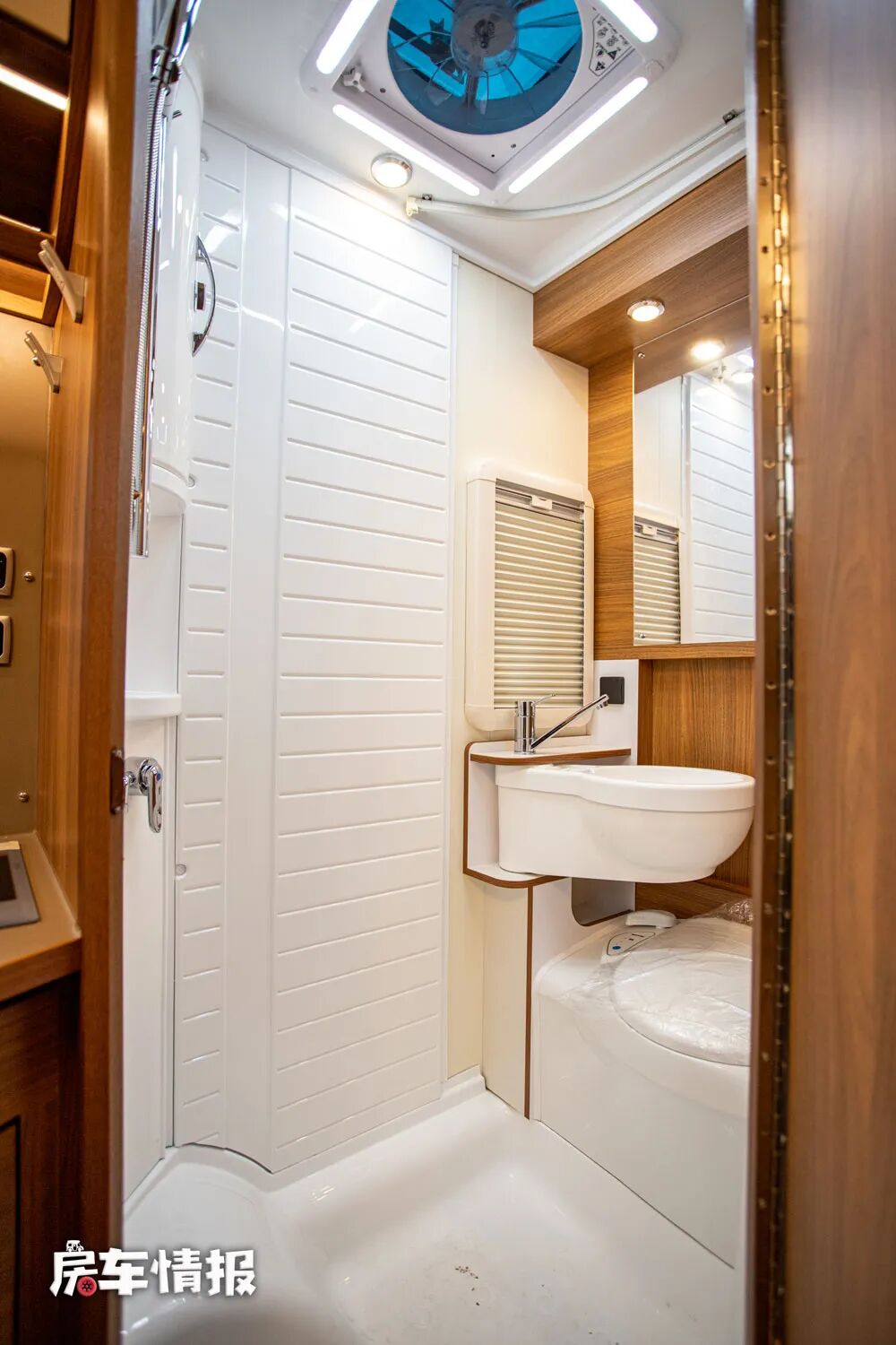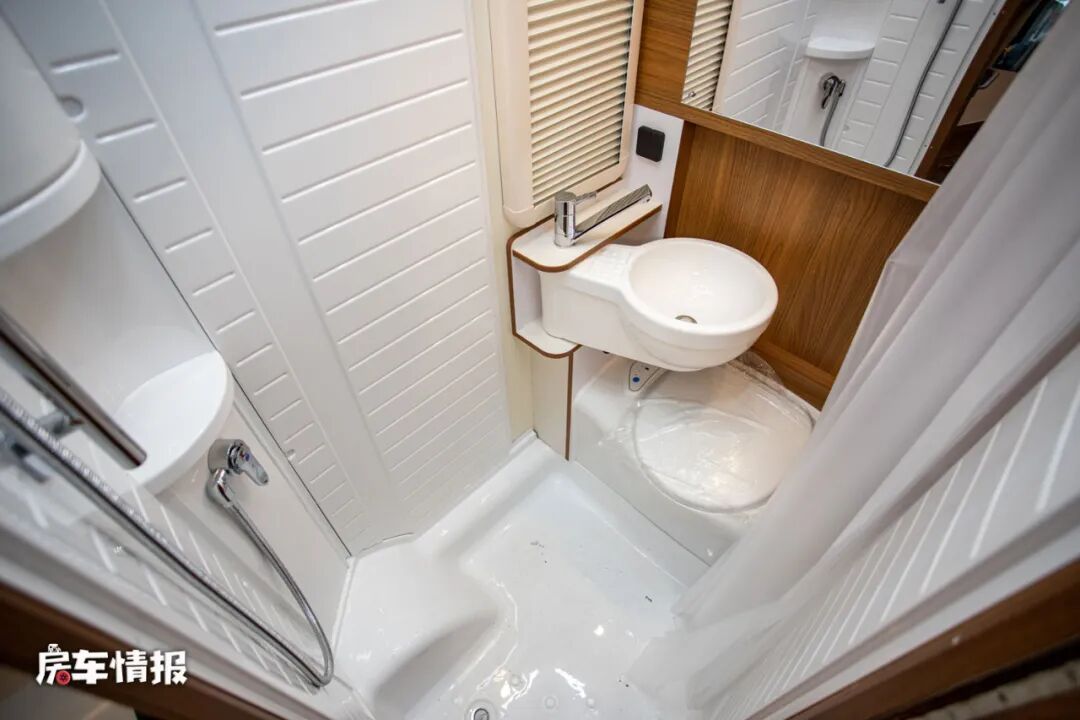厨房区后方是全车的独立卫浴室,采用一体吸塑式的设计,能够防潮防水延长整体的使用寿命,而且整体的空间也比较宽敞,带有固定式的马桶、可旋转的洗手台盆、独立的淋浴花洒和储物柜。