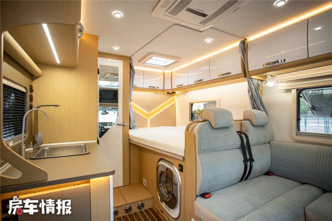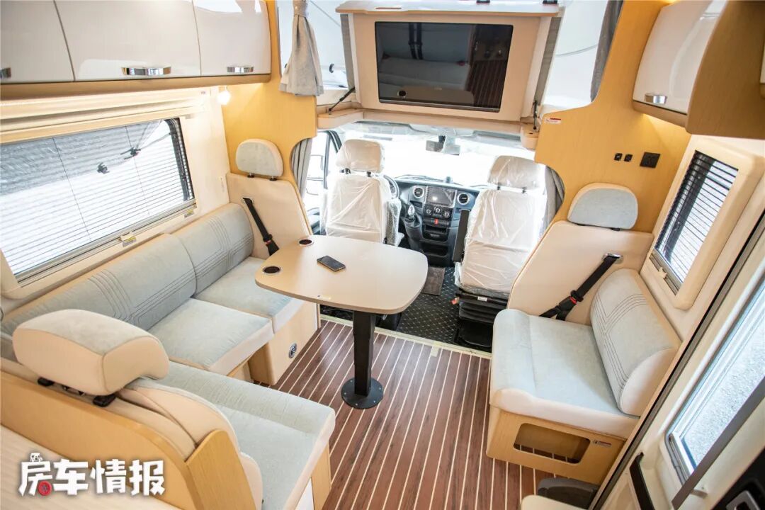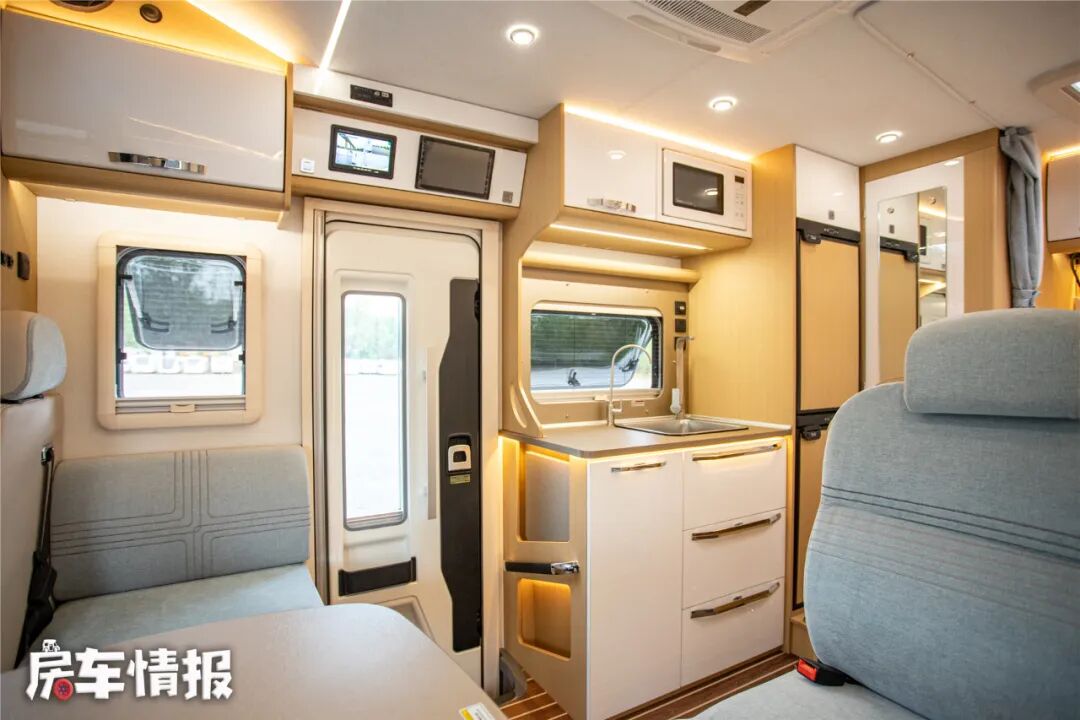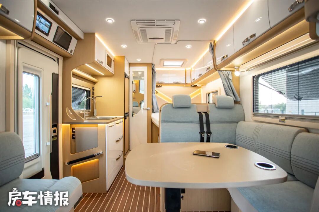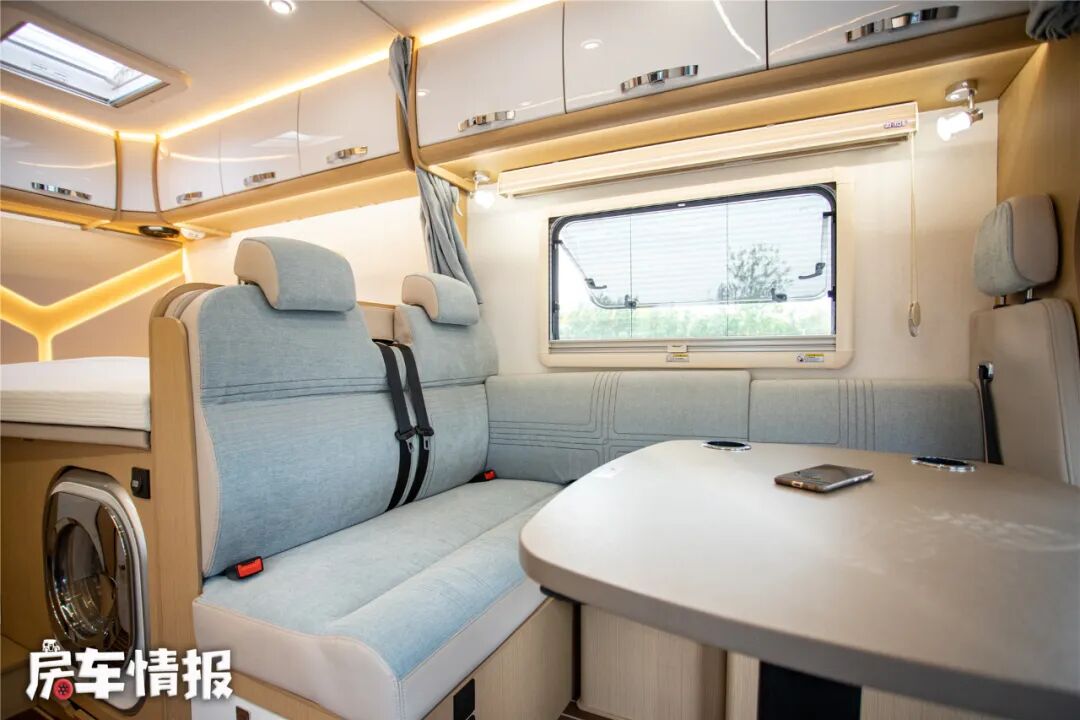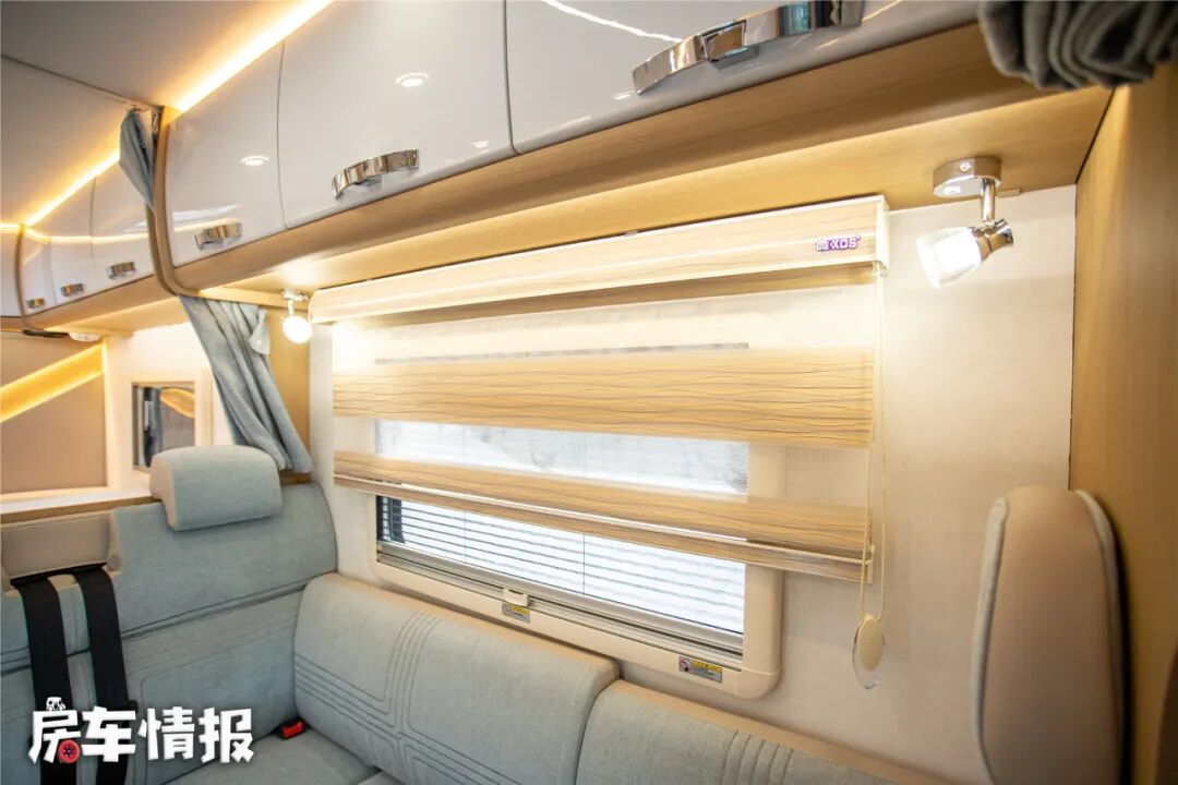 进入车厢内部,最直观的感受就是生活区非常的整体氛围十分清爽、通透,这点和车内采用的浅色系配色有一定关系,另外车身两侧的大尺寸外推窗也是功不可没,让人愿意在车内继续坐下去,不像有些品牌的车型,人一进车内,就会有压抑感和厌恶感。