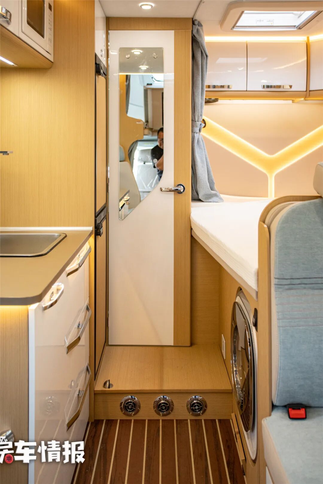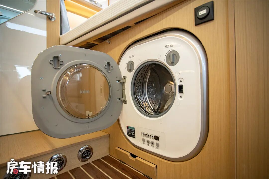 纵置床的底部还提供一台2.5kg的大宇洗衣机,对于长途旅行,偶尔有一些小件衣物,放进去清洗还是挺方便的。