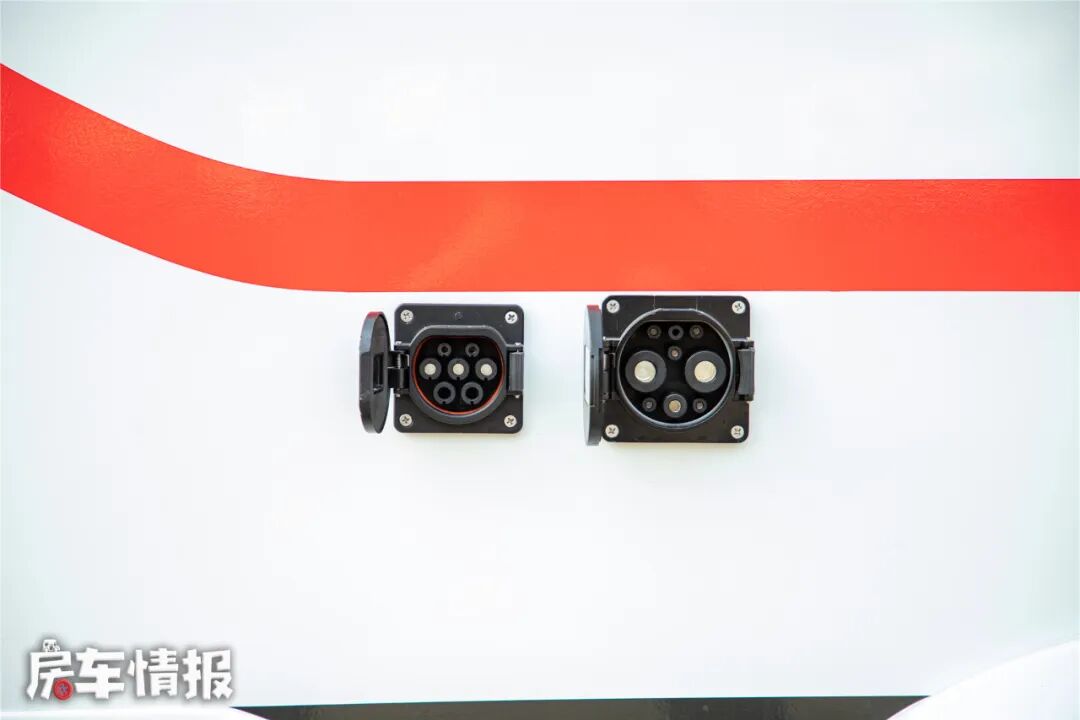 车身左侧同样是暗藏玄机,这里提供了两个新能源充电口,一个直流,一个交流可以满足在公共充电桩和家用充电桩上给车内补充电力,这款车标配了3000逆变器、840Ah锂电池和600W太阳能,相当于整车带了10度电。