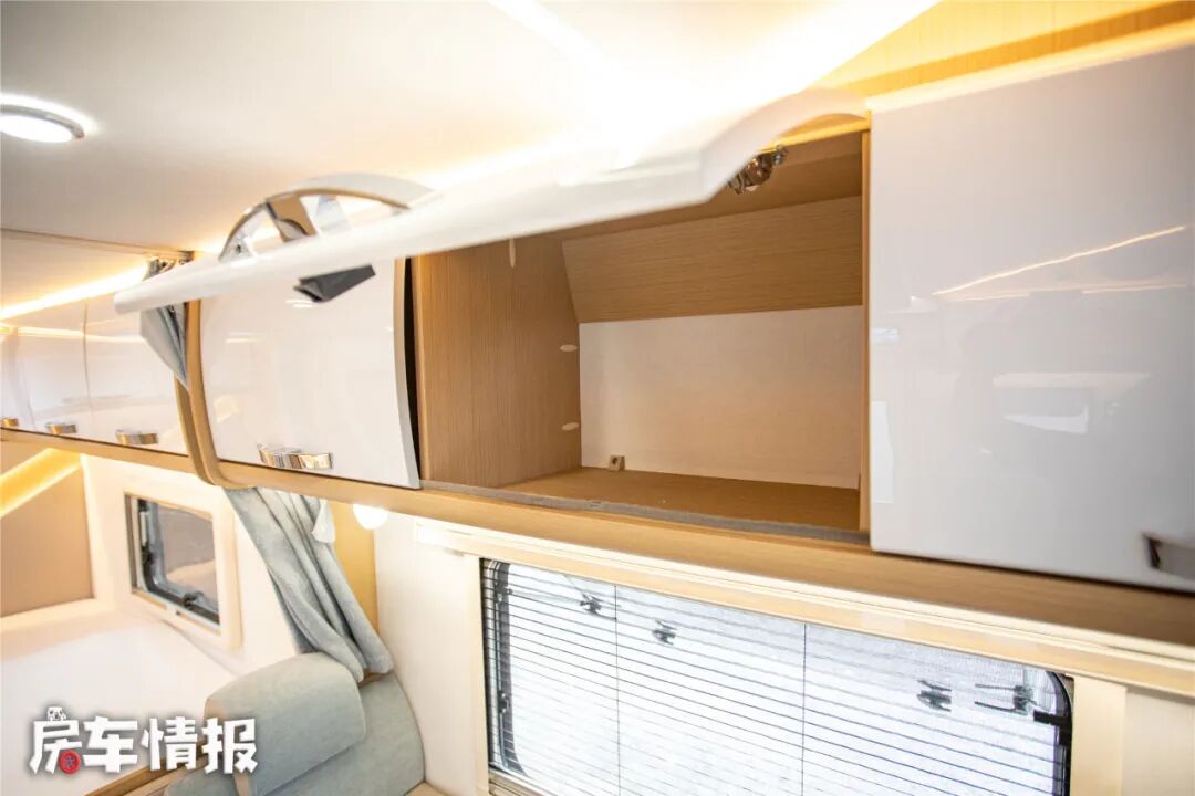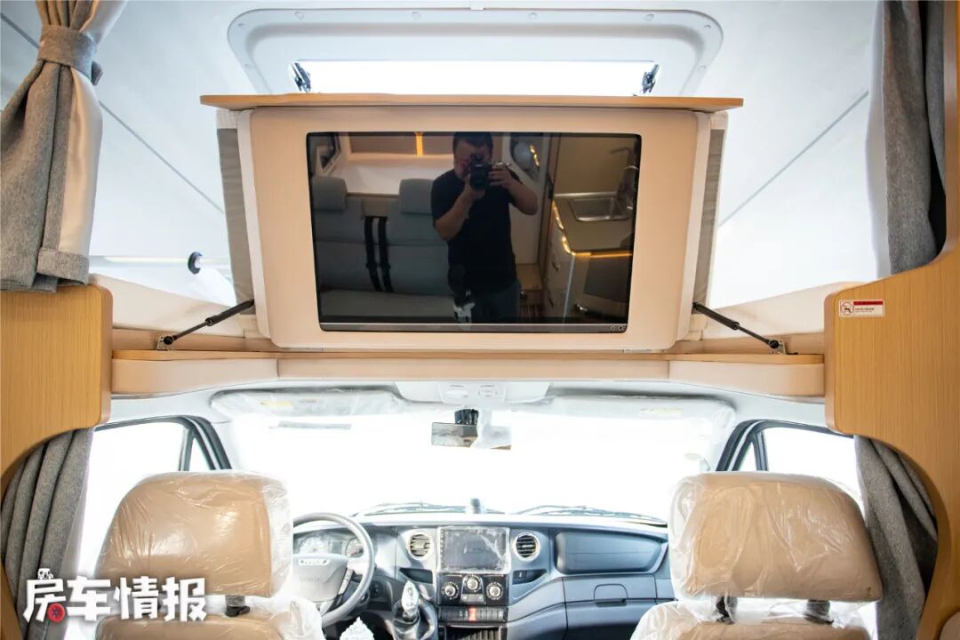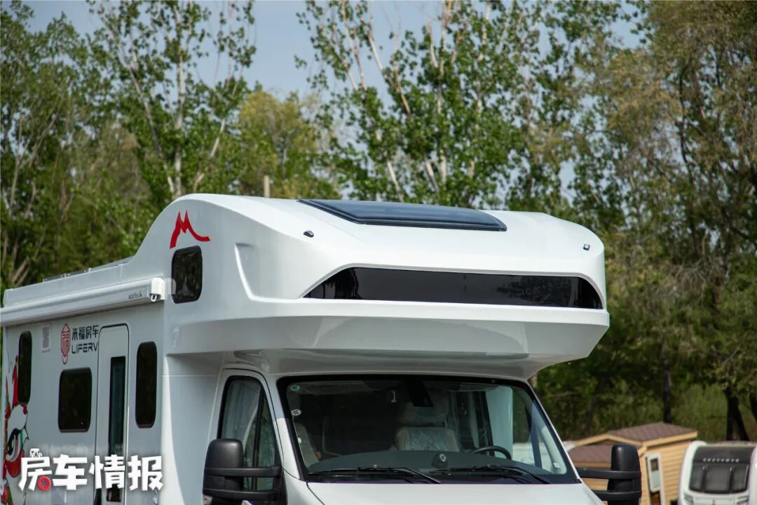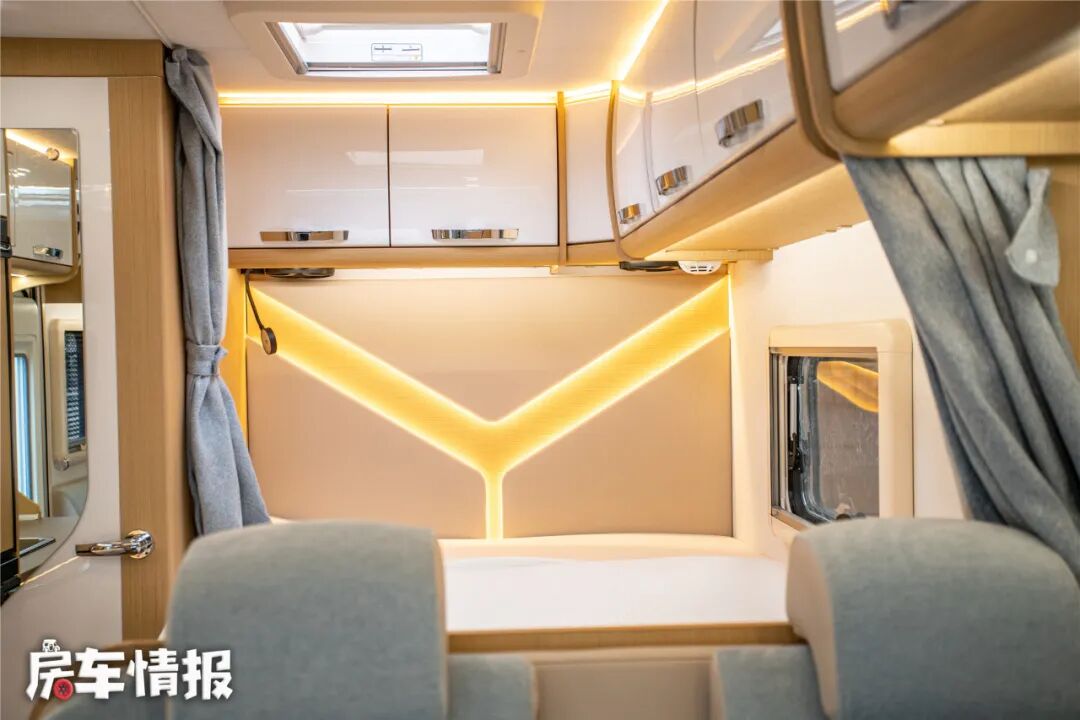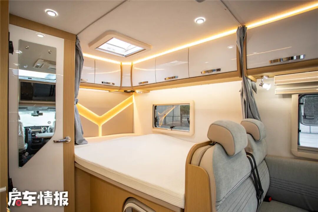 和大福房车采用的户型车窗不同,大贵房车额头前方的黑色仅为装饰板,没有做成一个个小的观察窗,毕竟不是每个人都喜欢躺在额头床上看风景,睡觉休息的空间还是更私密点的好。