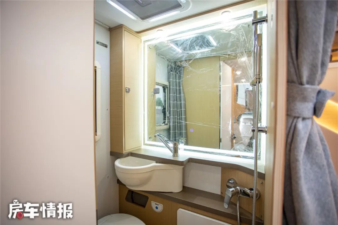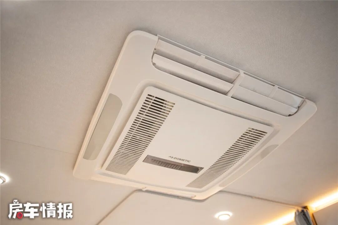 另外这里还提供了盒式马桶、可旋转洗手池、独立淋浴花洒、梳妆镜、换气扇等基础设备,搭配200L超大净水箱和70L灰水箱以及5kW燃油暖风热器,除此以外这款车还提供了一台多美达房车顶置空调。