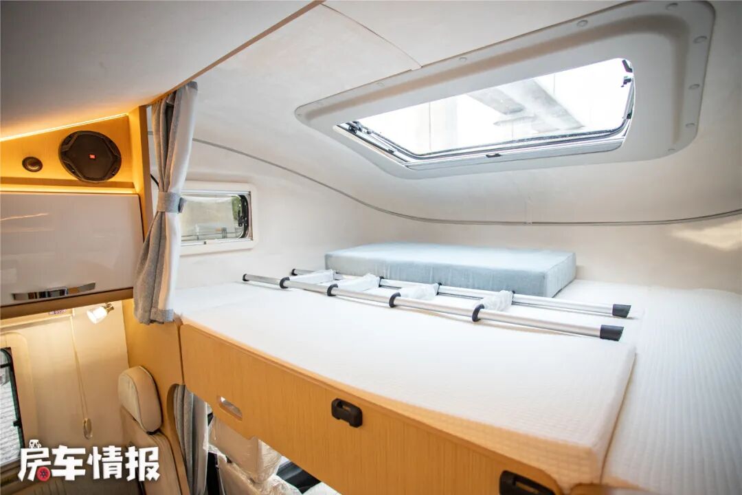 驾驶室顶部依然是一张大尺寸额头床,长宽高达到了2230*1500mm,这在C型车里绝对算是比较大的尺寸,正常睡下两名成年人完全没问题,另外在额头床内侧还提供了暖风出风口,就算是到了温度比较低的地方,额头床也能得到暖风的眷顾。