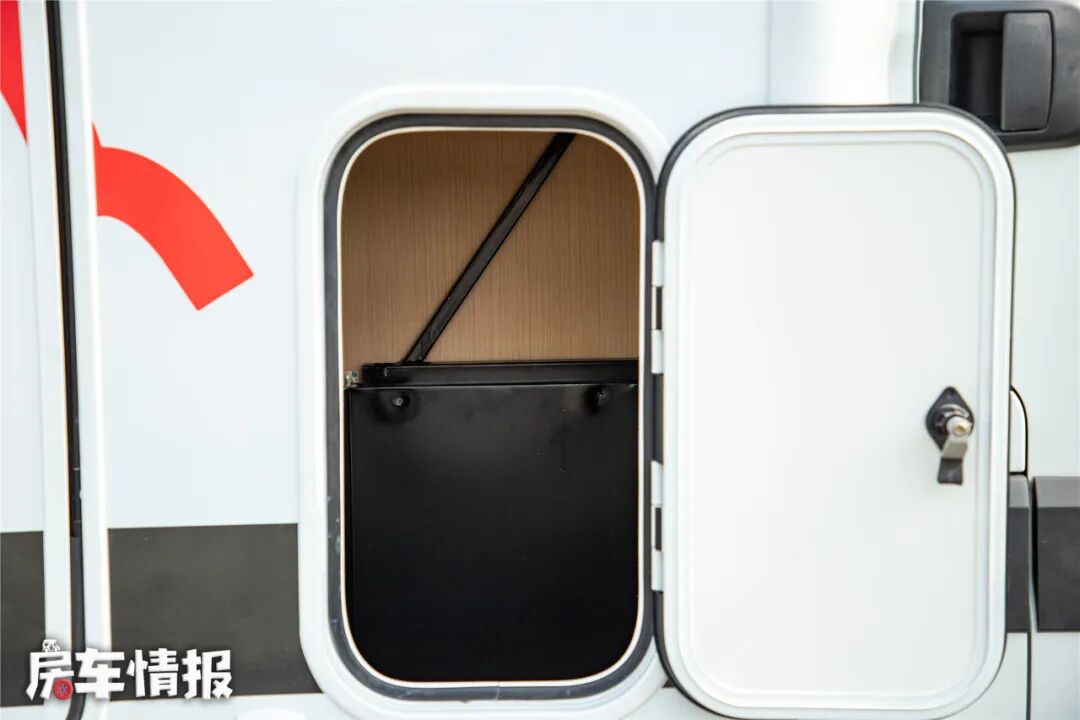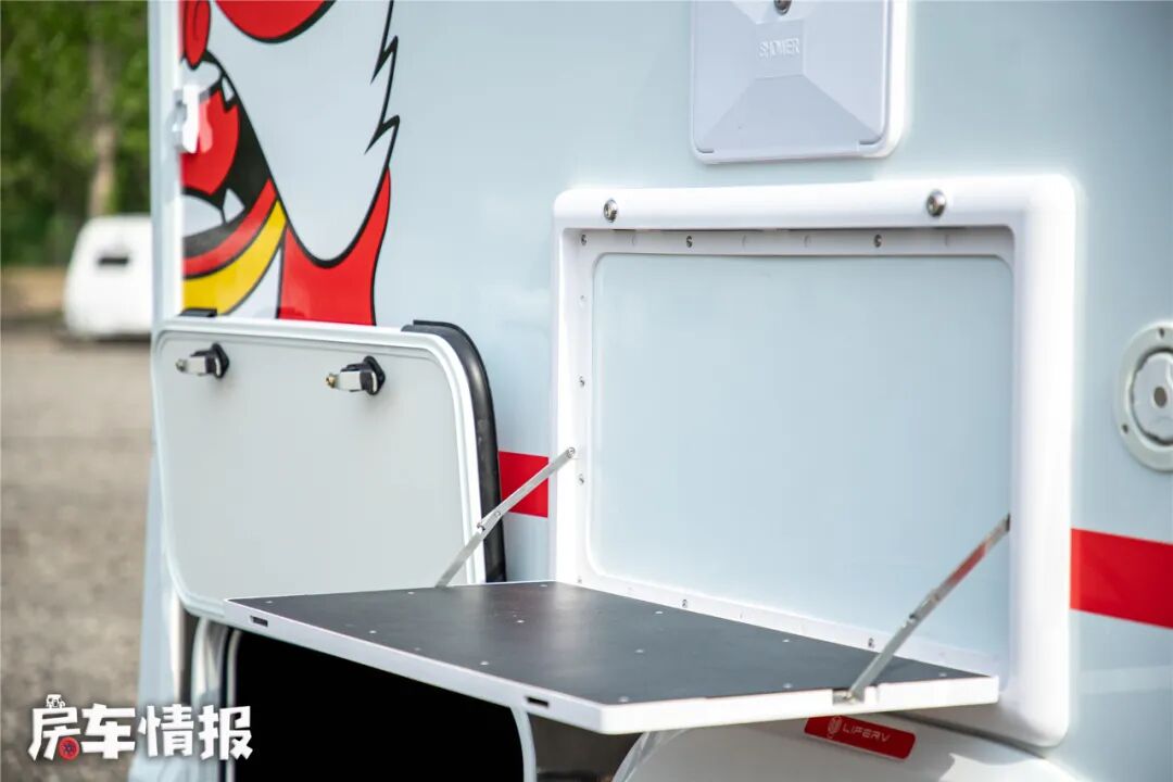 在外部功能性设备上,这款车提供的也比较齐全,右侧提供手动遮阳棚、外置物翻板、外置淋浴花洒、储物箱等,提升了日常使用的便利性。