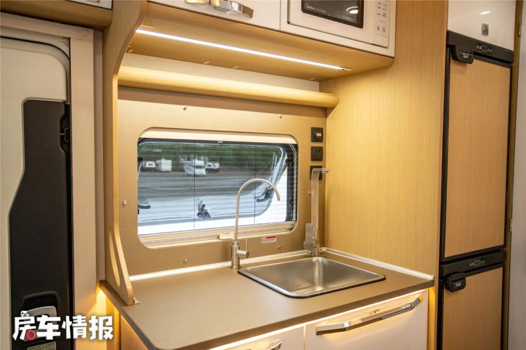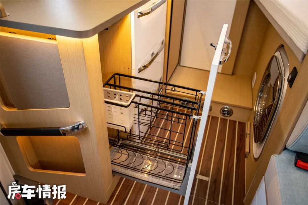 车内厨房位于中门后方,整体尺寸还是挺不错的,提供了微波炉、洗菜池、储物抽屉、房车专用冰箱等,位于橱柜内侧还提供了一个单独的碗筷架,既可以对碗筷进行固定,同时也方便对碗筷沥水。