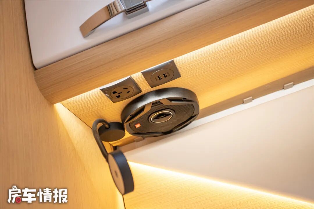 位于床头顶部的吊柜下方,提供了JBL音响,加上前方的两个JBL音响,整车的视听效果还是挺不错的,如果有更高的要求,也支持选装更高级的哈曼卡顿音响。