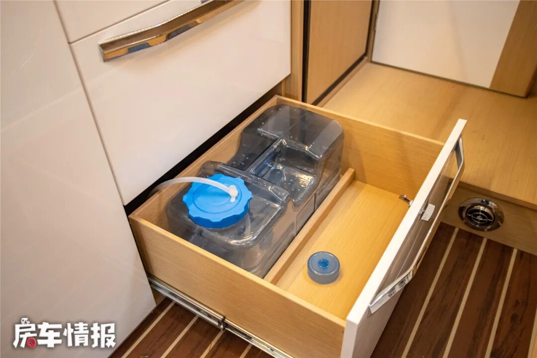 位于橱柜的最底层还提供了一个单独的直饮水水箱,这样就可以随时随地保证有干净的水饮用,比起带几个不好固定、又占空间的桶装水来说,这样的设计无疑更方便。