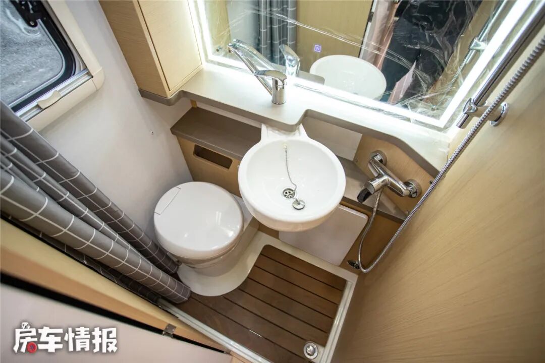 卫生间位于车厢尾部,内部的设计还是挺让人意外的,横向布置的空间预留出了更多空间,尤其是淋浴区域的空间更大,成年人在内部洗澡也可以轻松转身。