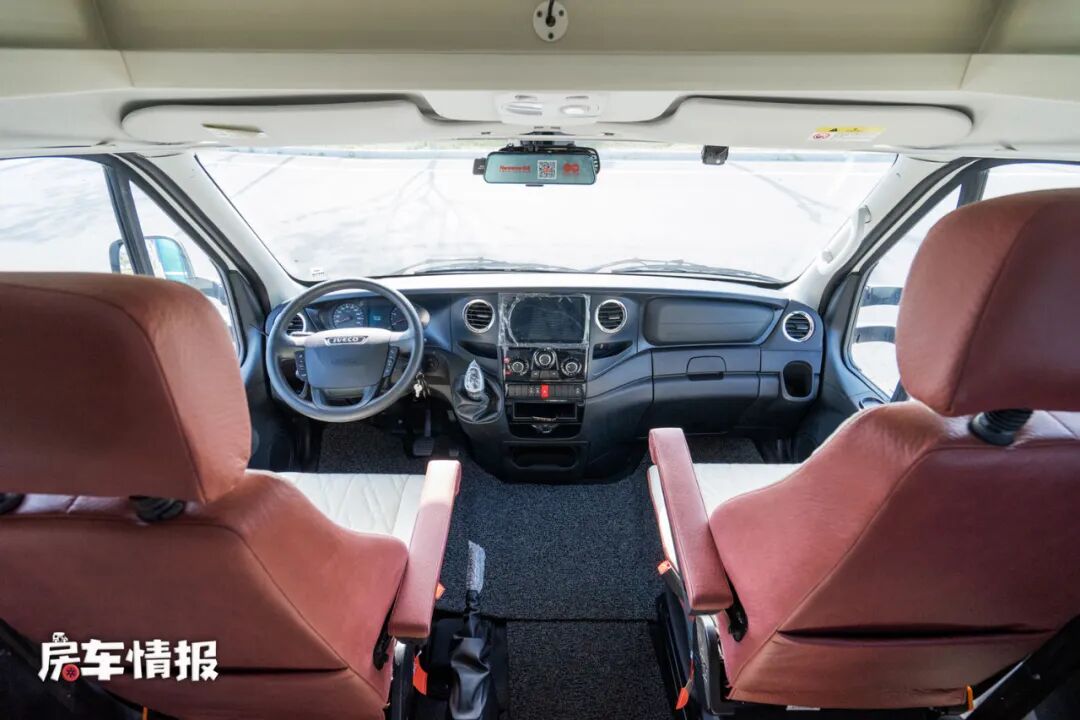 动力上,搭载依维柯欧胜底盘是采用了3.0T柴油发动机,匹配8AT变速箱,最大功率125kW,最大扭矩400N·m,满足最新的国六排放标准,结合车身尺寸,日常C本就可以驾驶了。同时整辆车还提供了胎压监测、车道偏离预警、ABS防抱死、定速巡航等功能,以保证车辆的安全性。