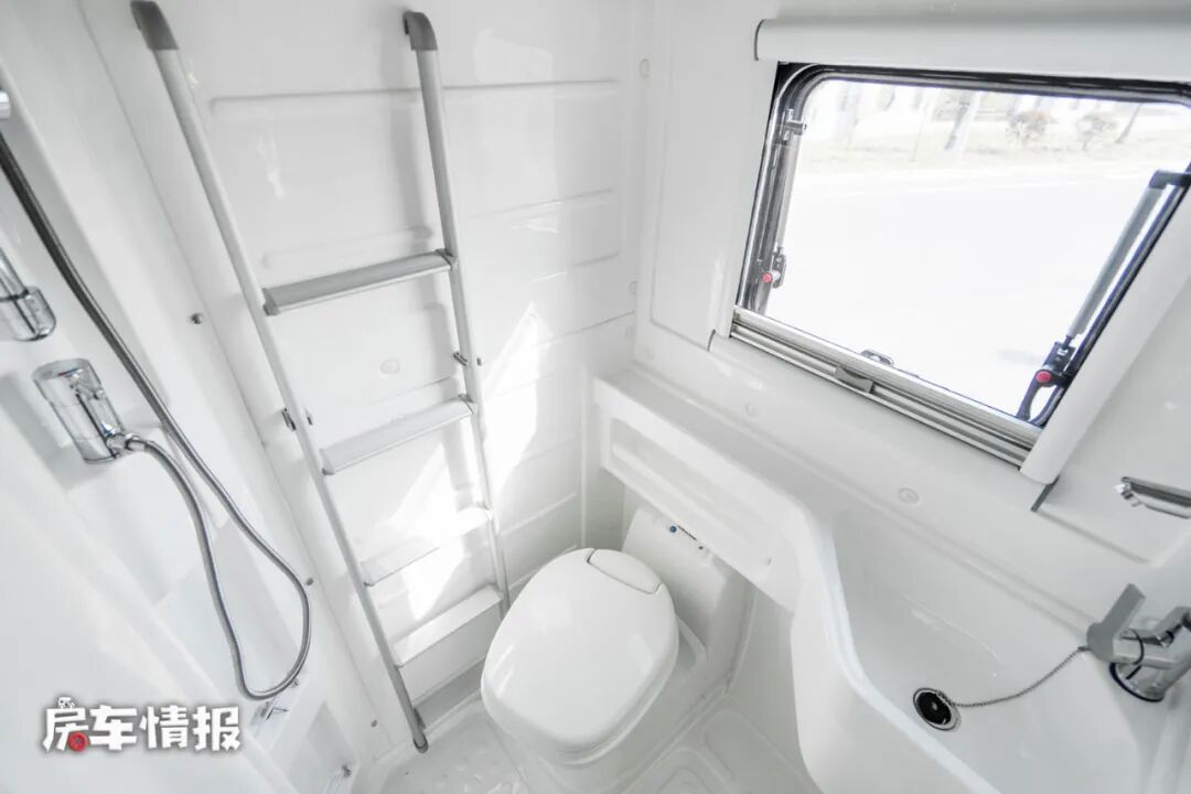 而在最里侧角落里的则是全车的独立卫浴室,内部提供了马桶、固定的淋浴花洒、盥洗台、梳妆镜等,以满足日常的洗漱如厕需求。