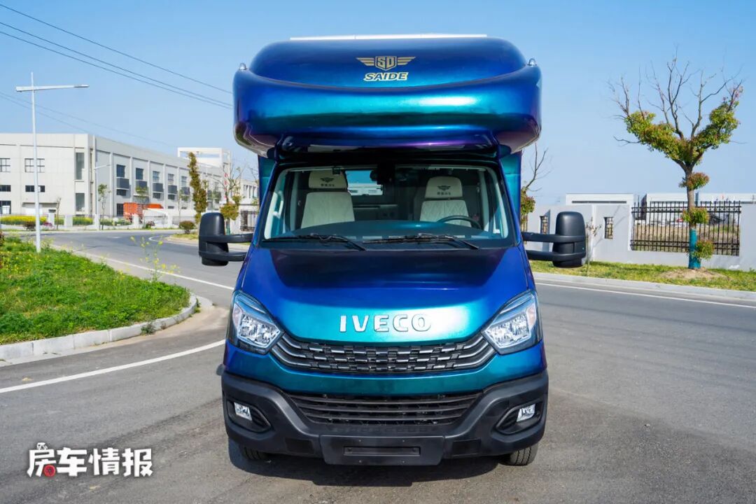 这款新车是基于国产依维柯欧胜底盘所打造的采用大额头式造型的标准C型房车,和其他我们之前介绍的赛德白鲸系列房车不同的是,这款车是采用了猎鹰系列的炫彩外观,阳光之下更显得耀眼夺目。