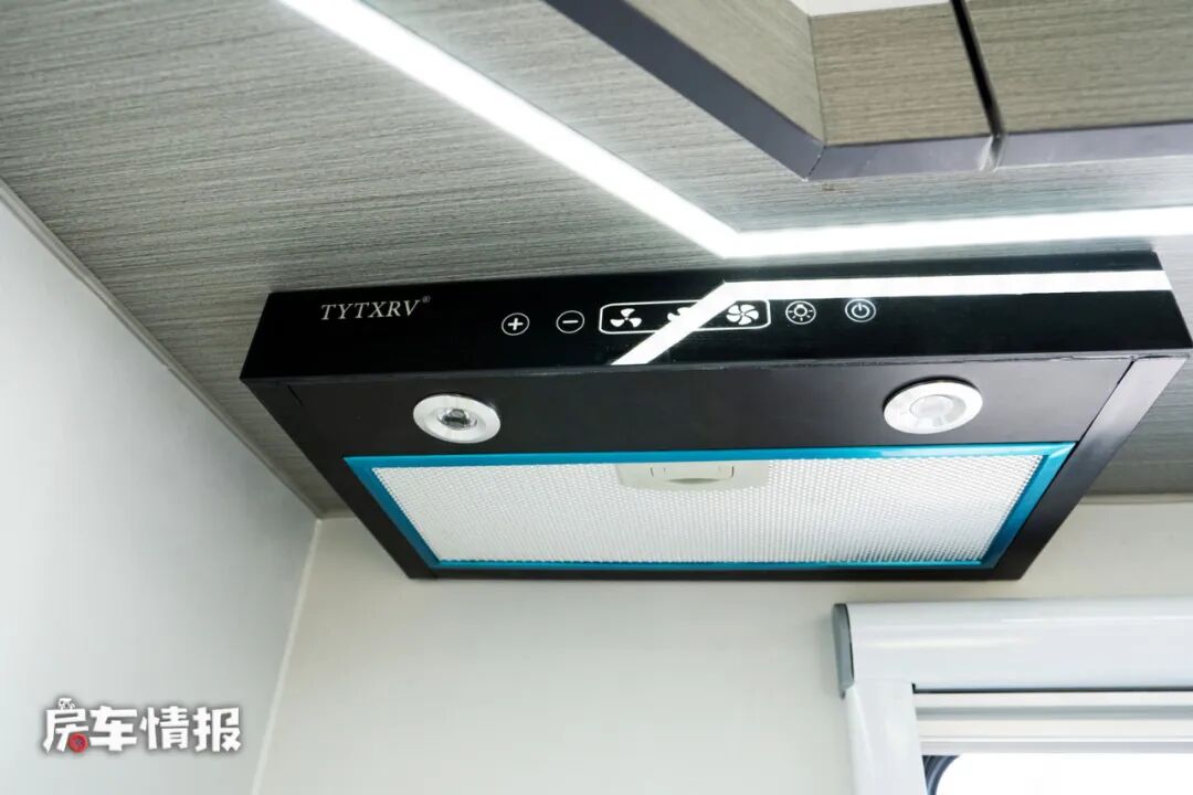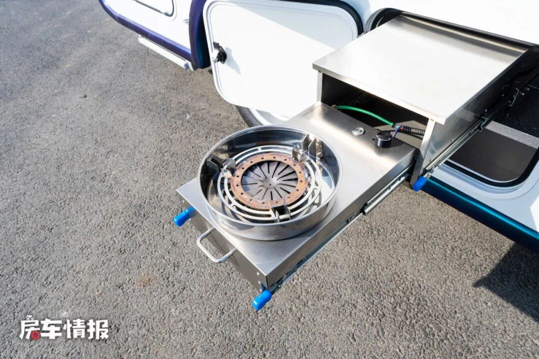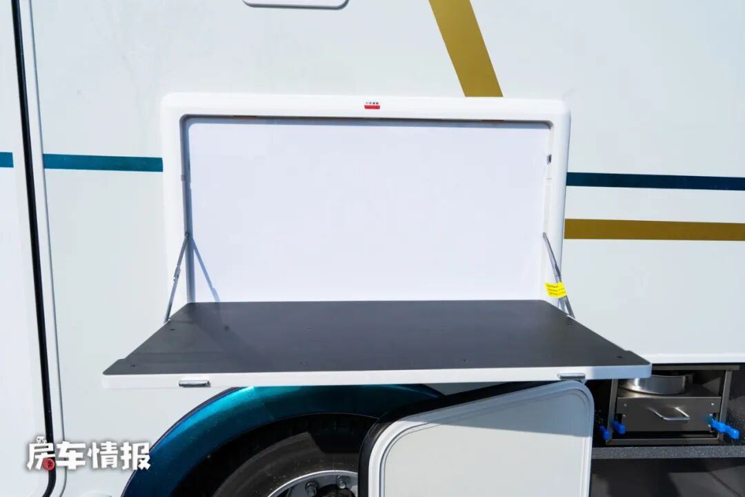 车身外部配置的比较丰富,打造了一个户外的烹饪就餐区域,提供了基础的遮阳棚、户外灶台、外置翻板、水电接驳口以及储物舱。