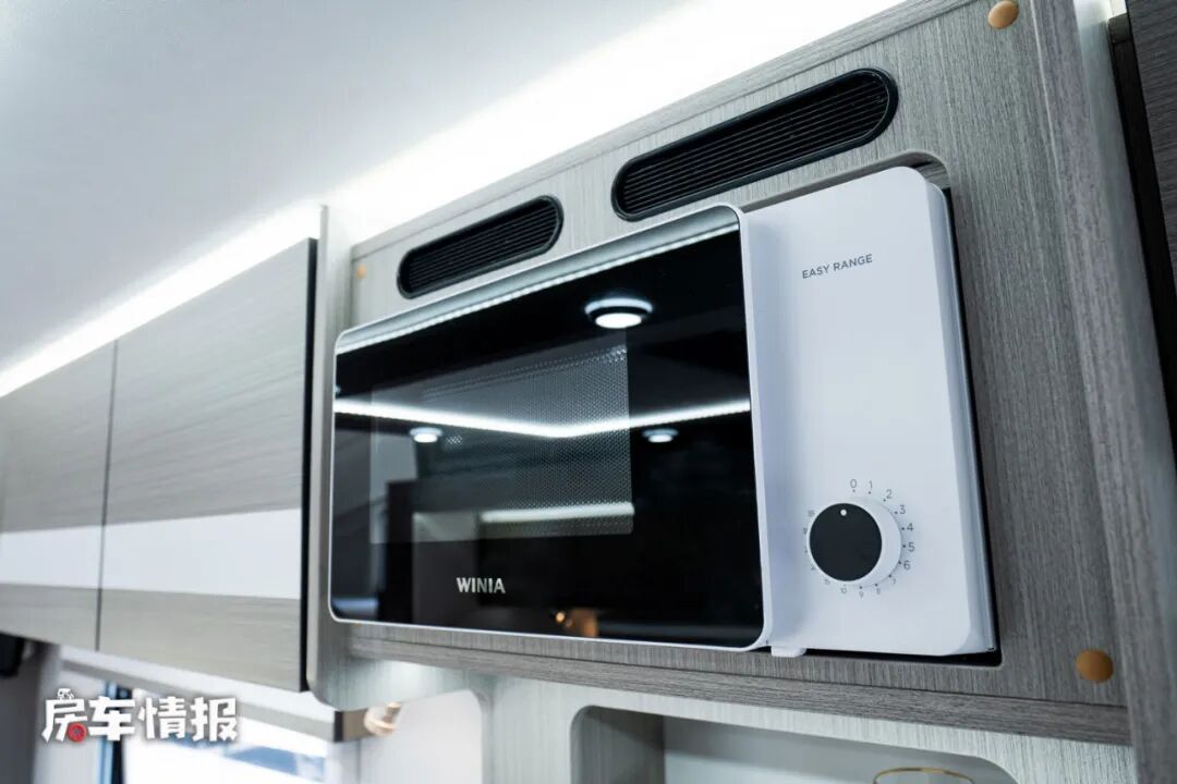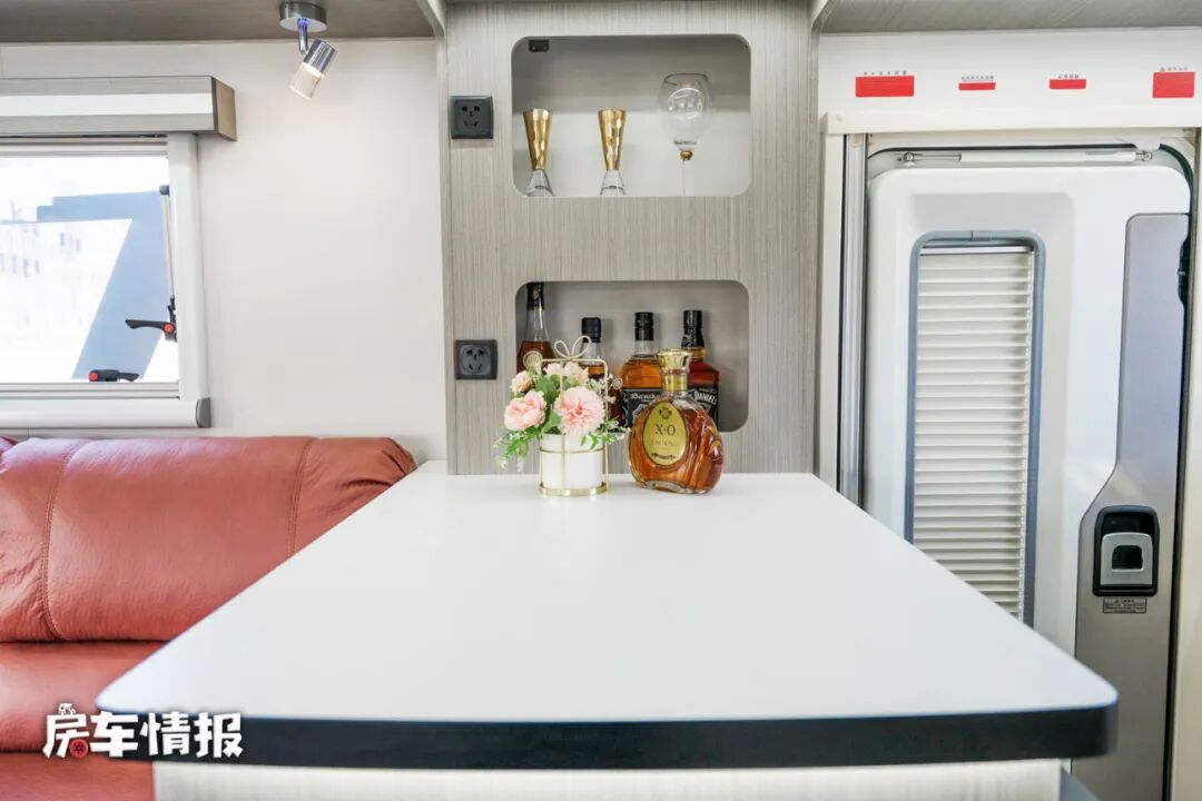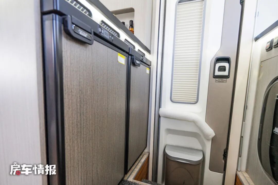 后上门的设计对应的就是后置厨卫区的设计,在靠近乘客门的地方是全车的厨房区域,门前是一个尺寸不错的的备菜桌,上方设计了置物架,下方则是一左一右嵌入了两台76L的单开门冰箱。