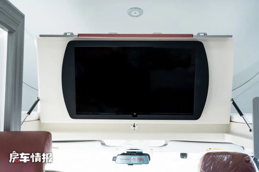 得益于圆润的额头外观造型,额头区内的空间还是非常可观的,两侧也配备了可采光通风的外推窗,床板下方则是提供了一台32寸的液晶电视,以提供基础的娱乐项目。