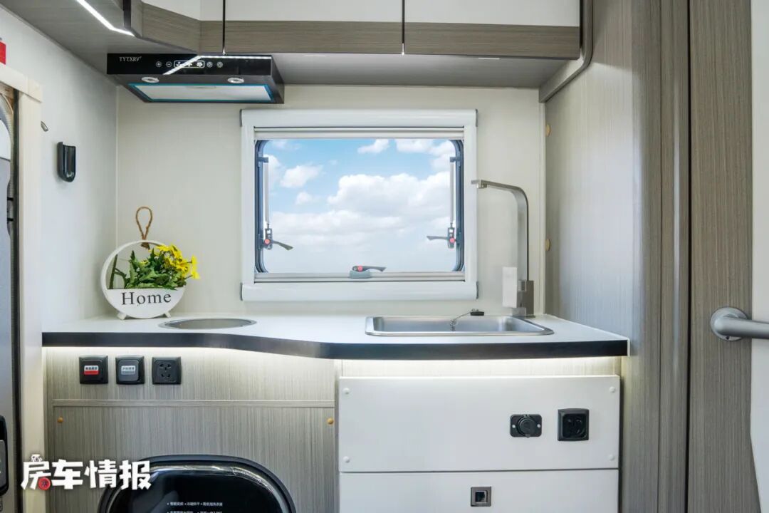 电路上,这款车是搭载了一台3000W的逆变器,两组共1000Ah的锂电池,以及顶部还配置了500W的太阳能电池板;水路上全车是拥有280L净水箱和60的灰水箱,满足日常的使用。