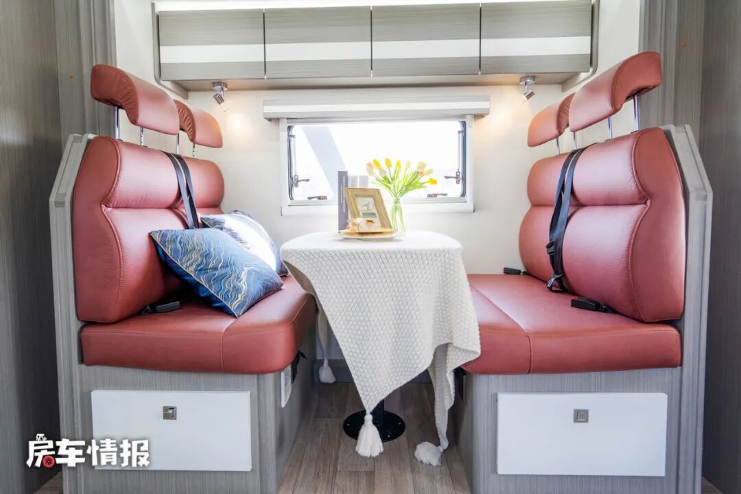 位于左侧拓展舱内的则是一个以经典四人对卡座沙发+升降餐桌设计的就餐区域,可以满足日常四个人的使用,顶部还配置了基础的吊柜,日常可以存放一些包包或者日用品,方便拿取,晚上休息的时候,整个就餐区域还可以变成一个小型的单人沙发床,可以睡1-2个小朋友。