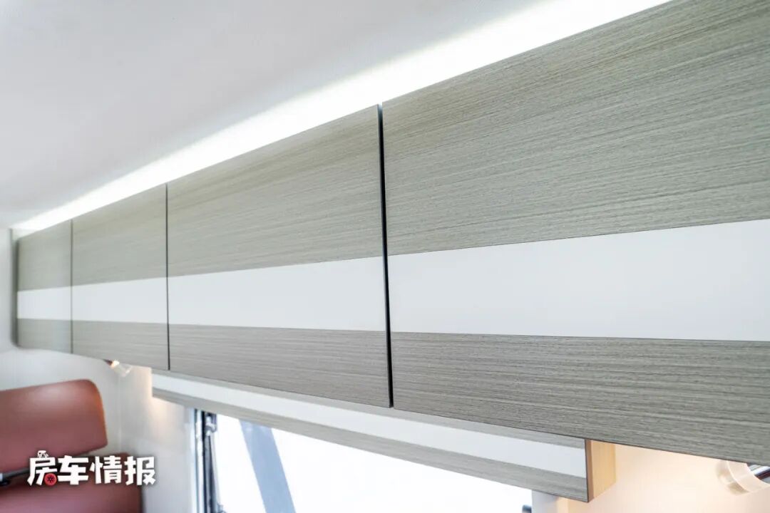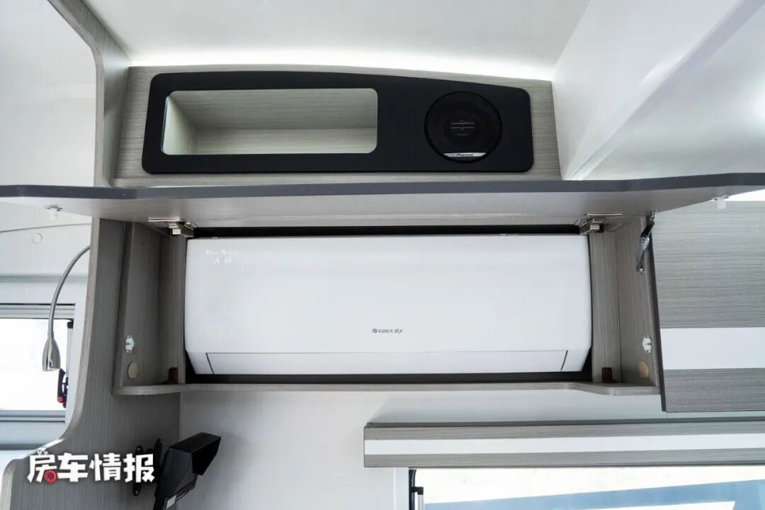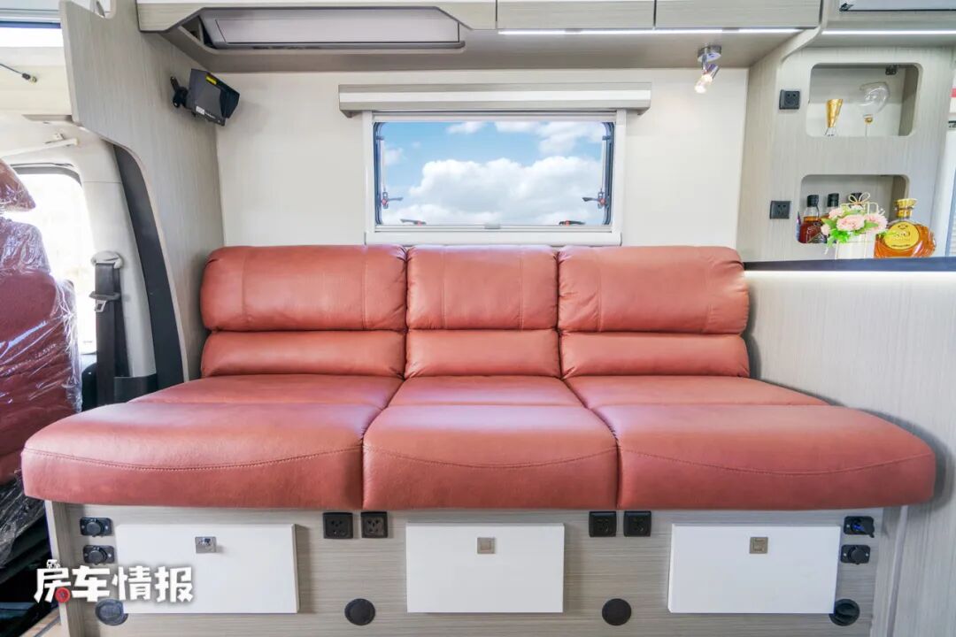 与之相对的,在另一侧则是一张长条的沙发,不过由于并没有配置安全带,所以乘车时不能够坐人,沙发也是采用了皮质软包的工艺,填充的比较饱满,可以带来不错的乘坐感受,沙发下方还设计了几个小型的储物柜,顶部也带有基础的吊柜,以及一台家用变频空调,可以按需调节车内的温度,从而达到一个舒适的居住环境。晚上这张长条沙发也可以拓展开变成一张小型的沙发床使用。
