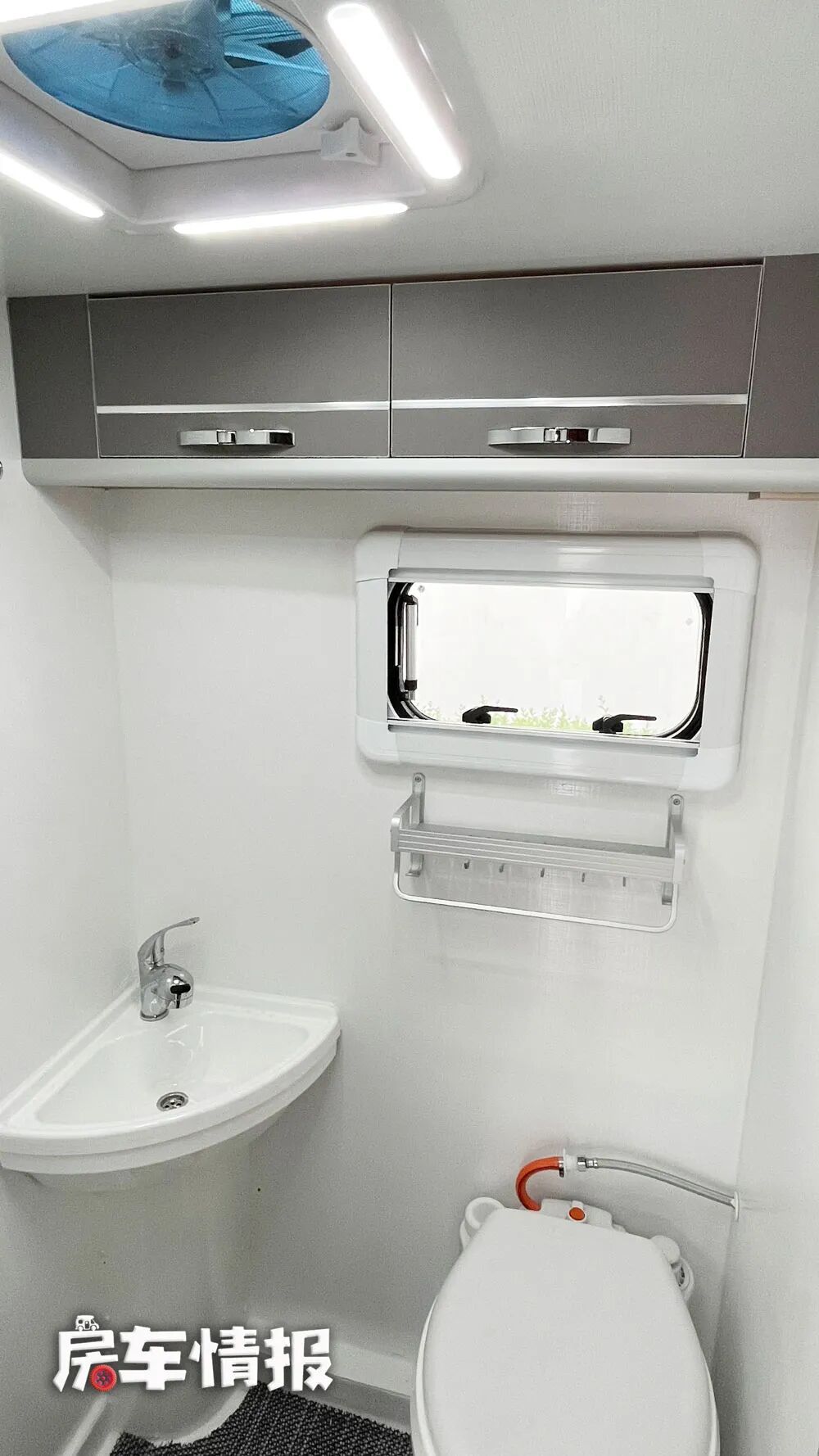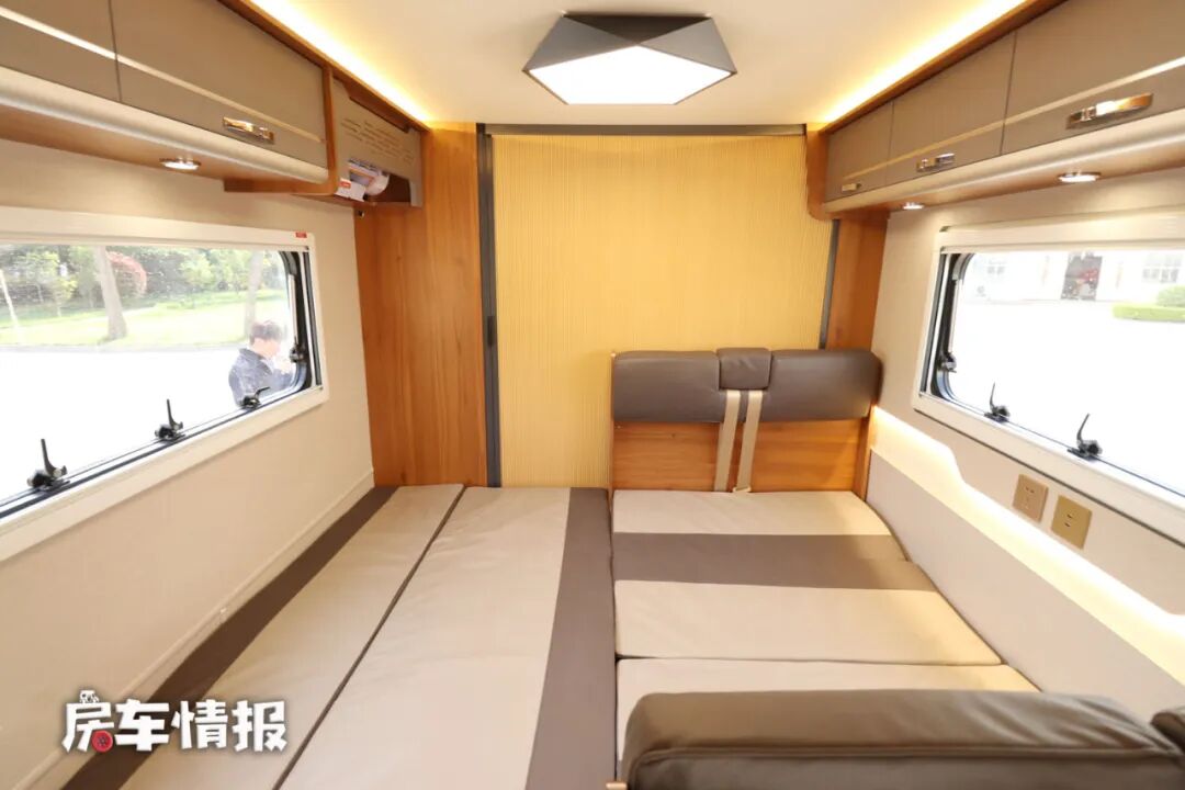 因为车厢的外宽不到2.2米,所以内部的空间并不是特别的理想,因为采用的后上门的设计,所以车内布局和我们常见的单拓展房车有几分相似。