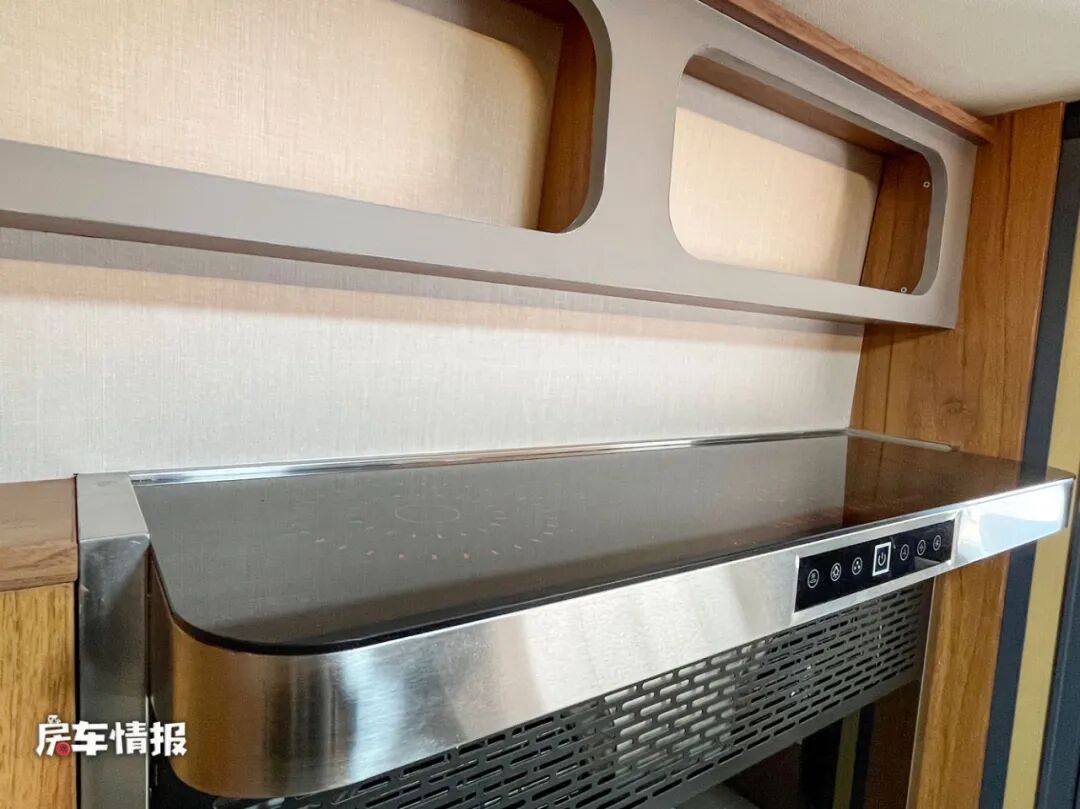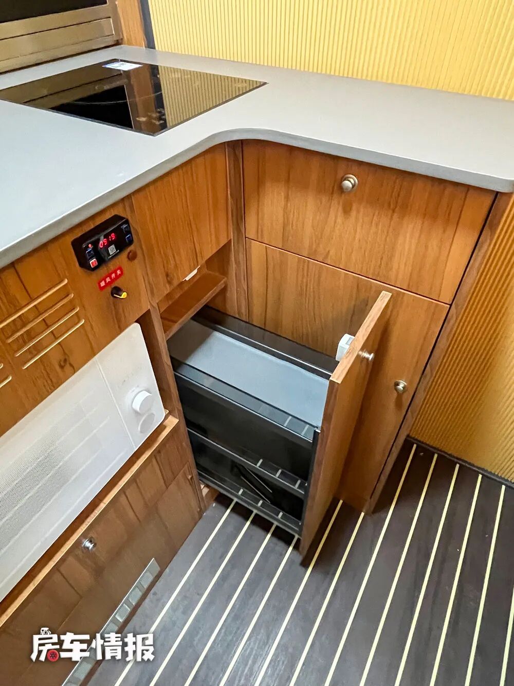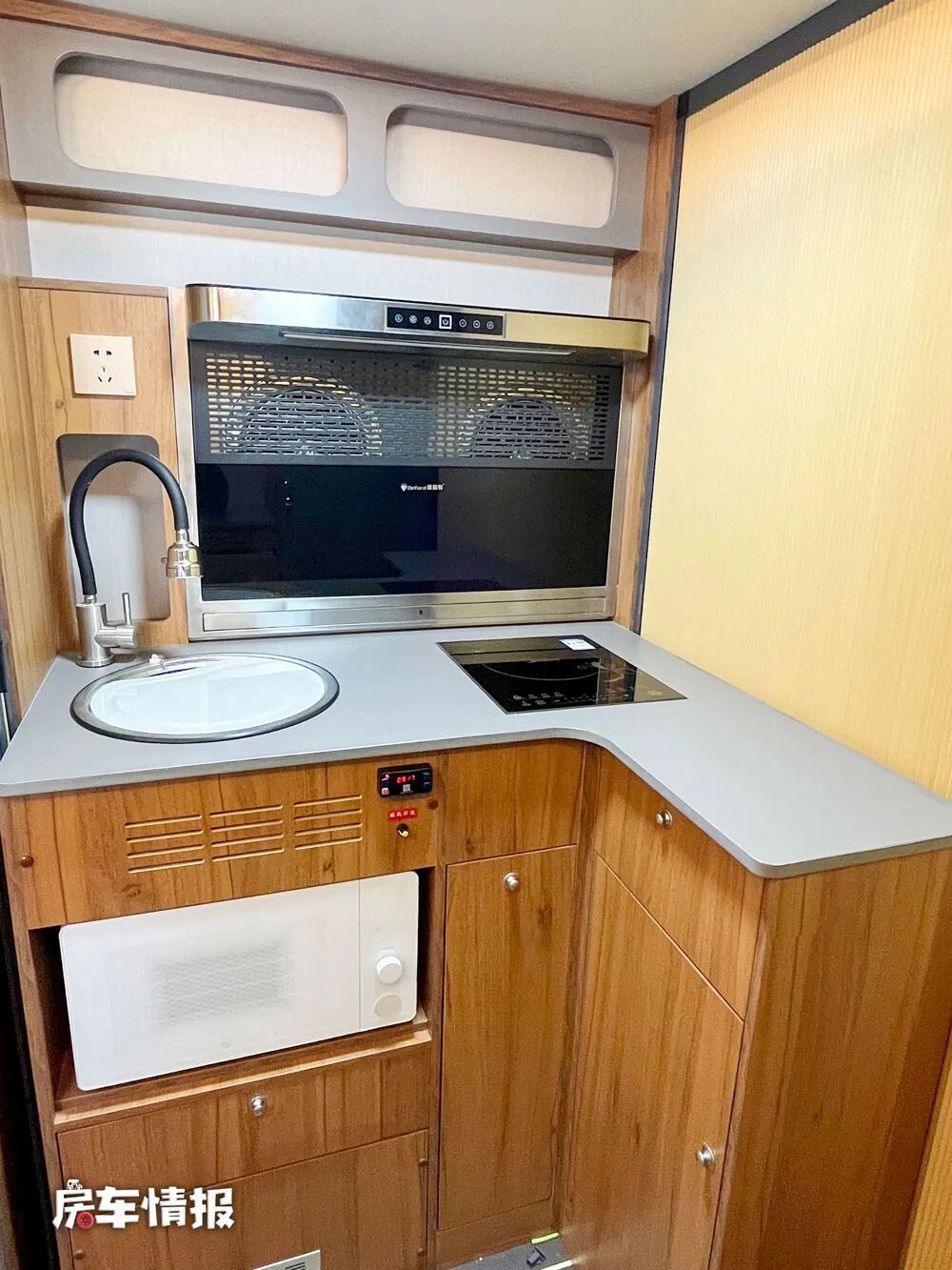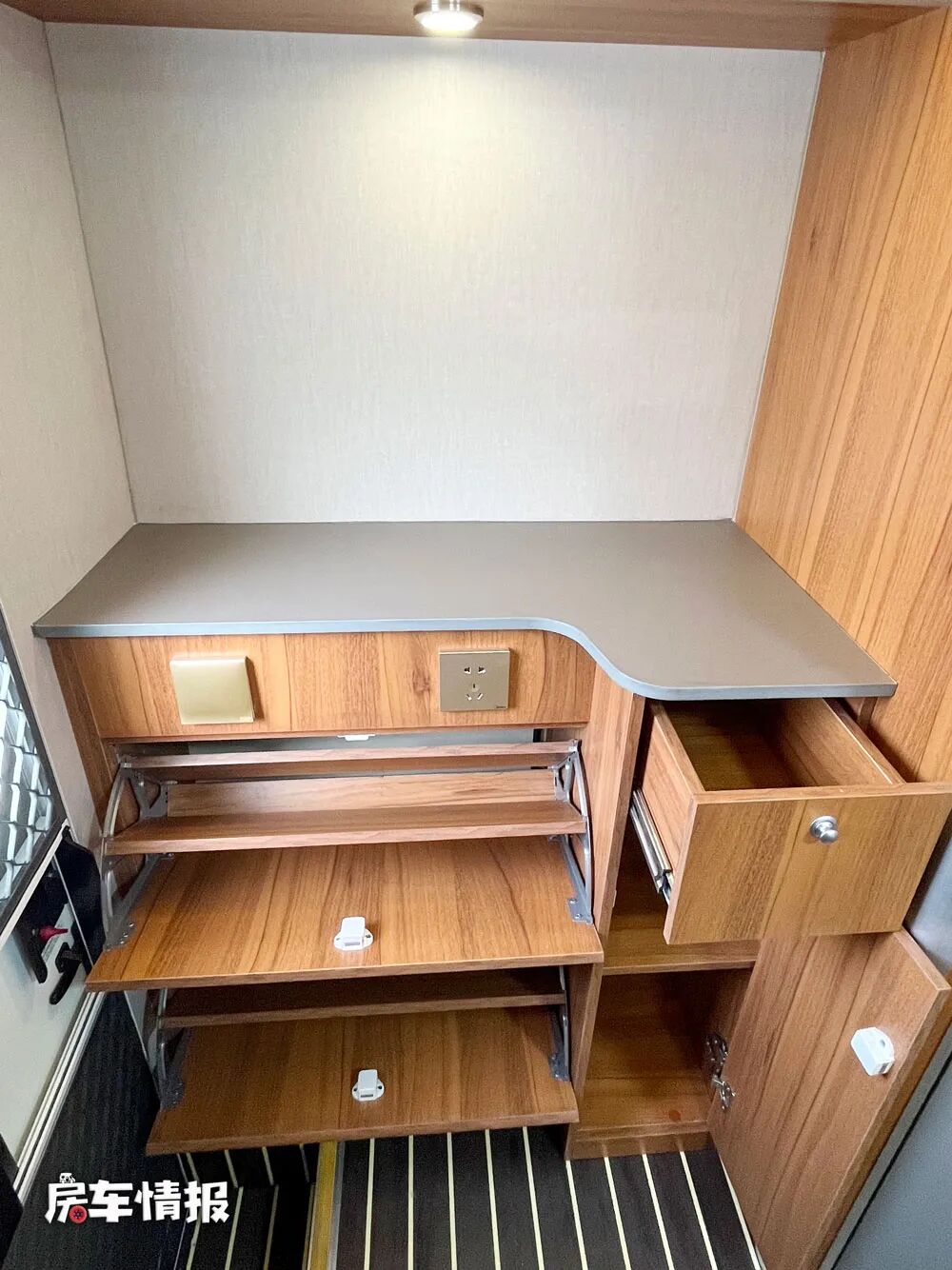 虽然说因为后上门的设计,整体是采用的后置厨卫区的布局,不过和我们常见的设计完全不同,全车的厨房操作台是位于四人卡座沙发的后方,最有两点的一个设计是,为了保证前方休息区的安静,在会客区后方加入了隔挡帘的设计,可以说非常的人性化了。