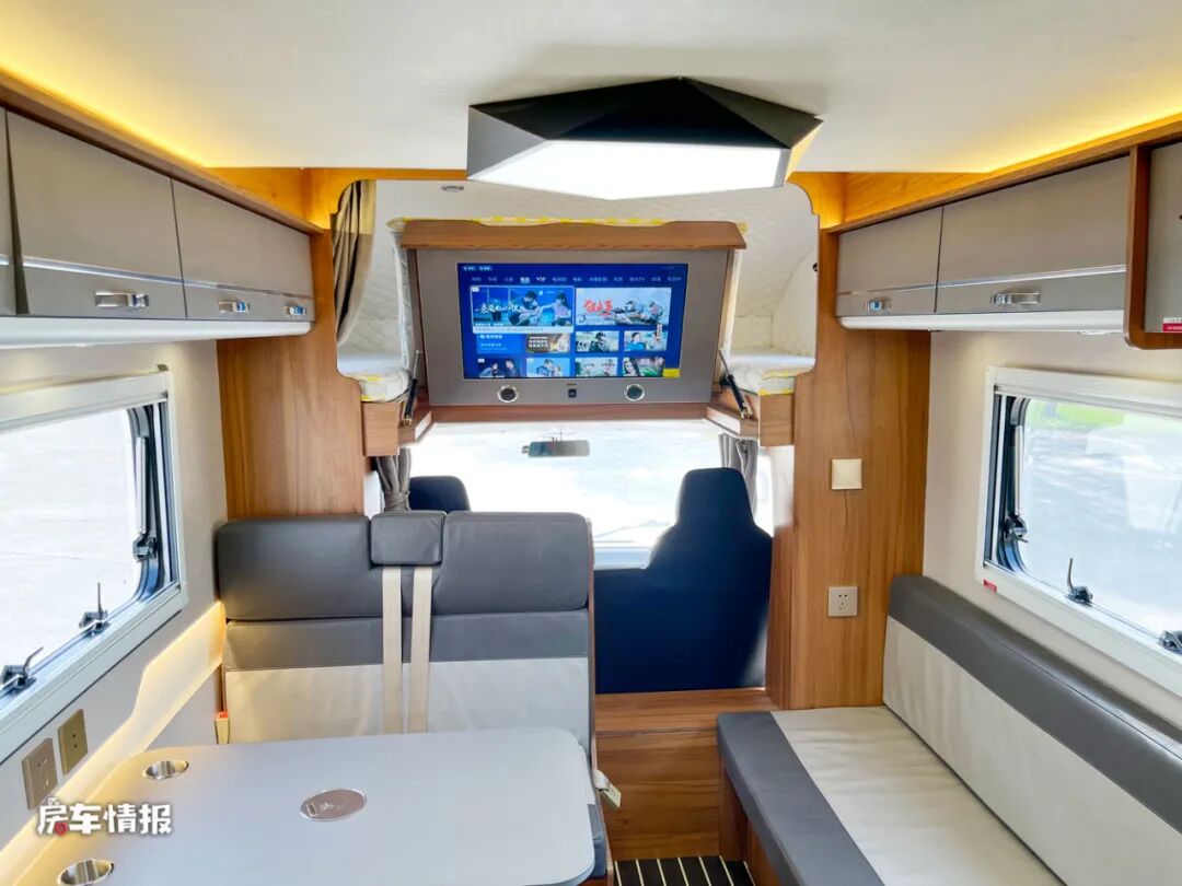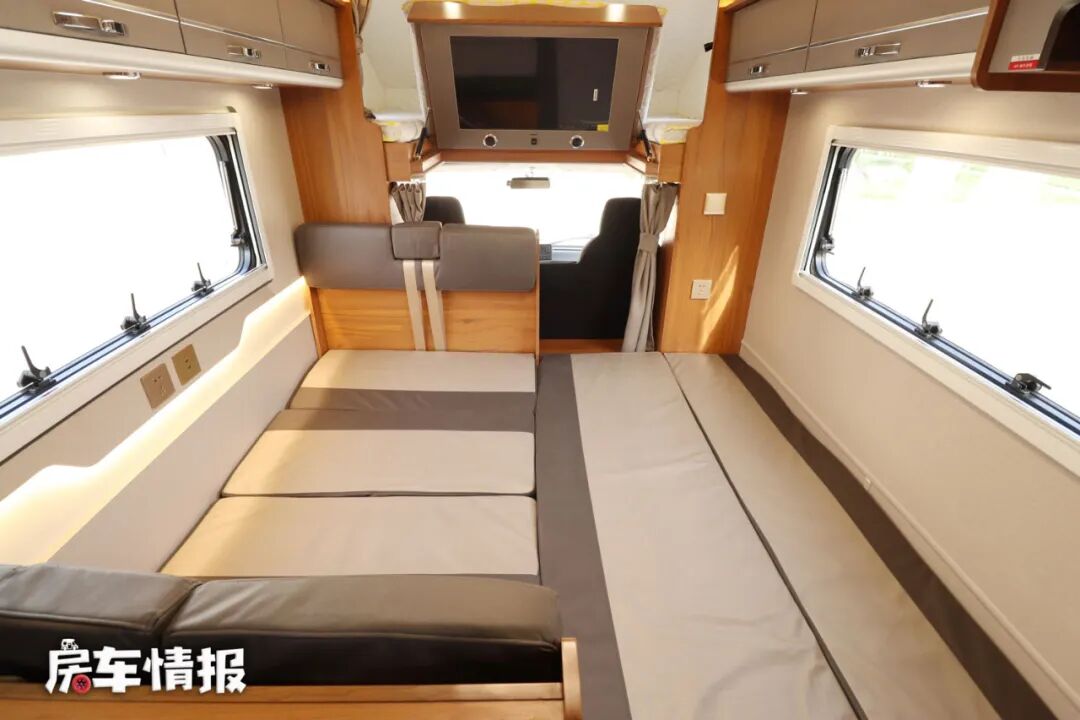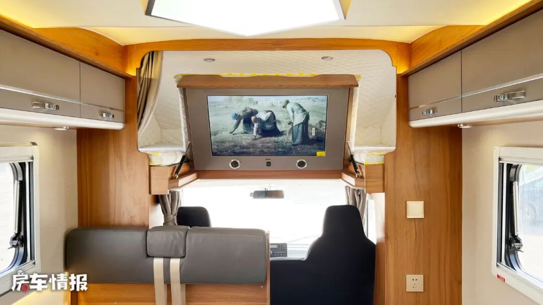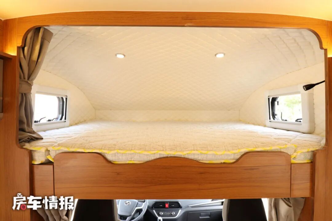 最前方驾驶室上方是额头区域,得益于额头外部的造型设计,内部的空间表现还不错,床铺尺寸为1950*1350mm,日常可以满足两个人的使用,两侧还带有通风换气的推窗,床板下方则是标配了一台32寸的小米智能电视,可以满足日常的娱乐需求。