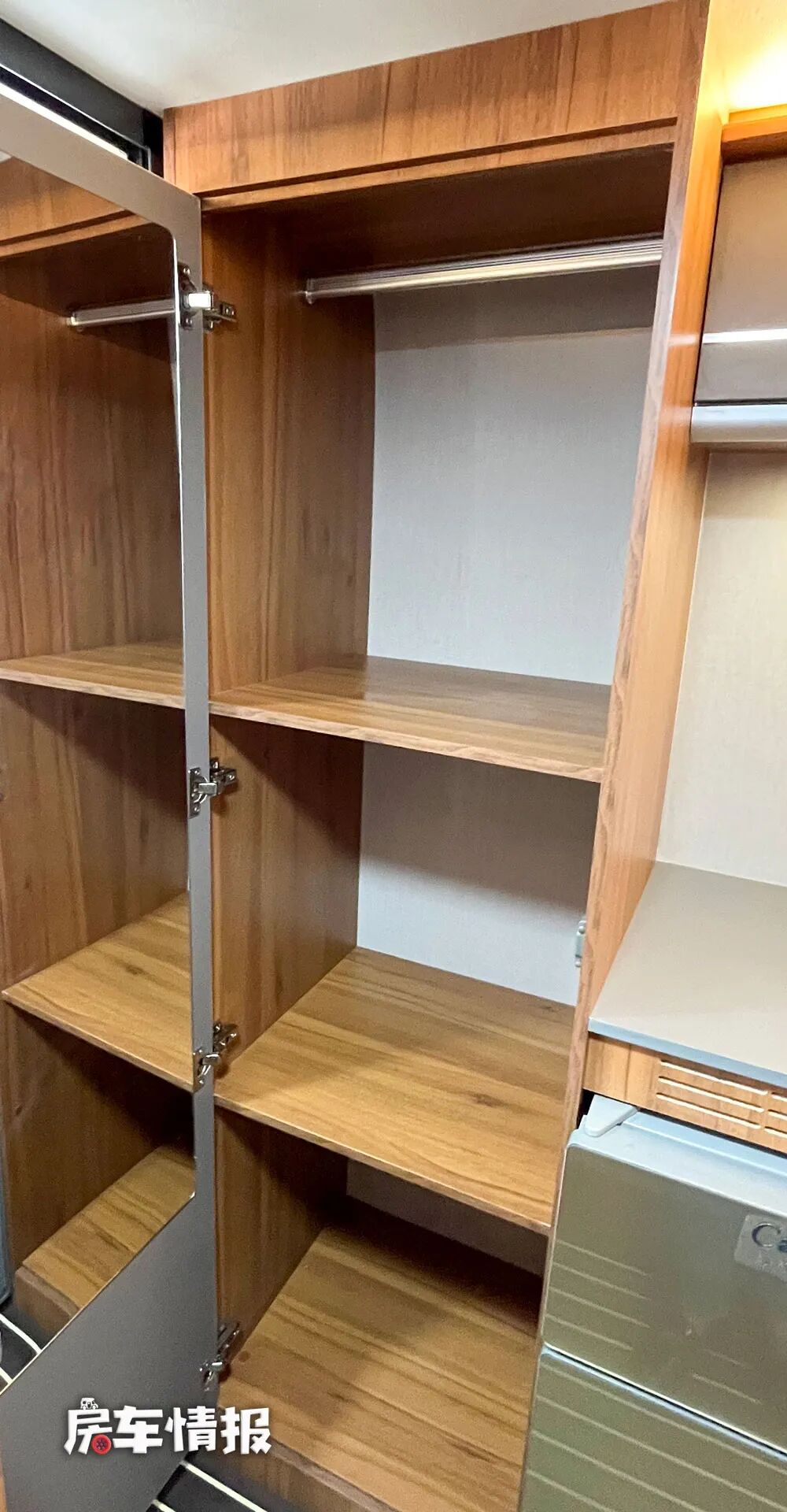 与之相对的,在乘客门的前方,则是整辆车的大衣柜,和一台108L的双开门车载冰箱,可以分类存放食材。