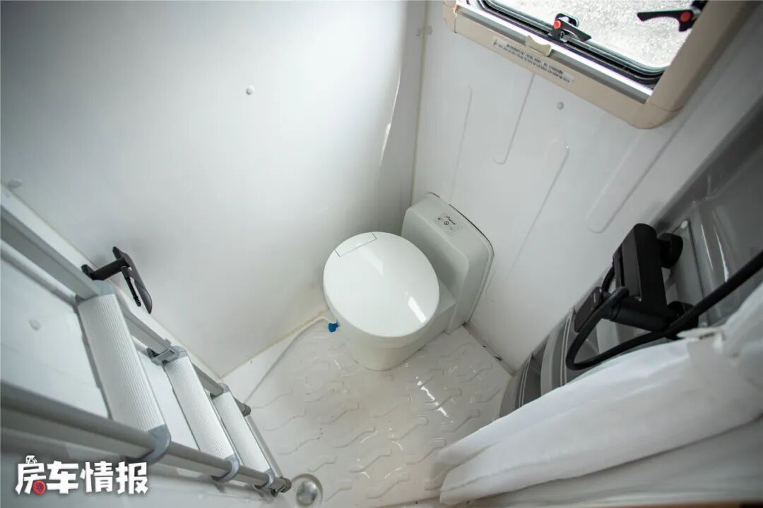 如果想要如厕或者洗澡的话,还提供了一个独立的空间,由于没有了洗手池等设施,内侧空间还挺大,提供了盒式马桶、独立淋雨花洒等,日常使用的便利性挺不错。