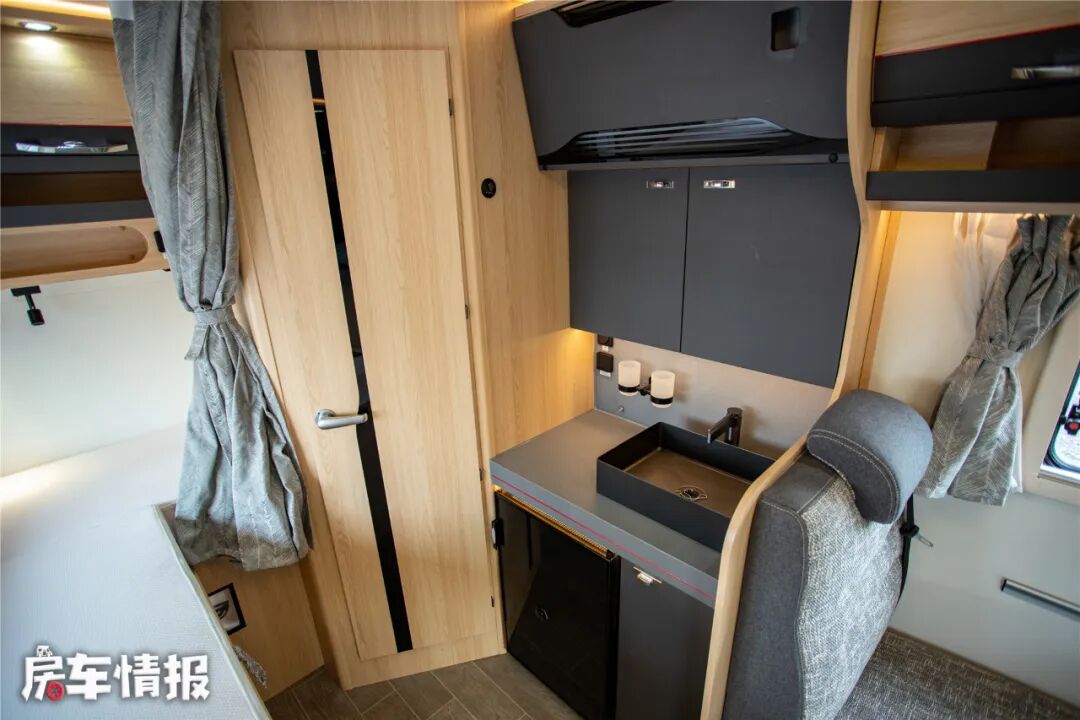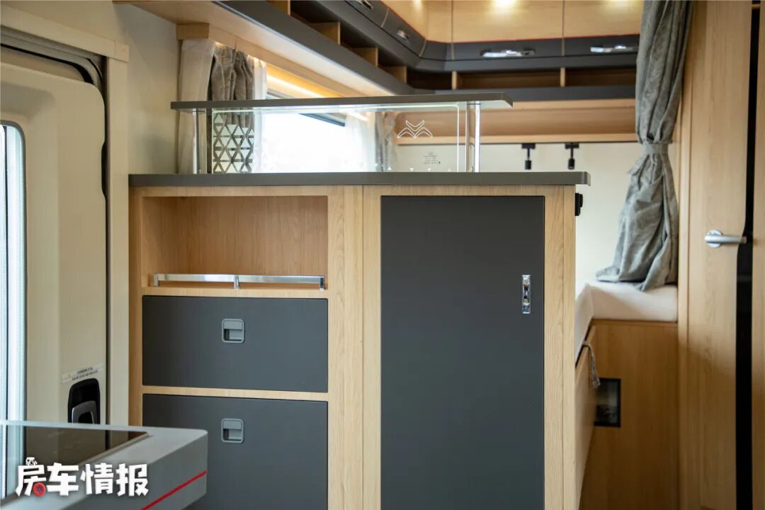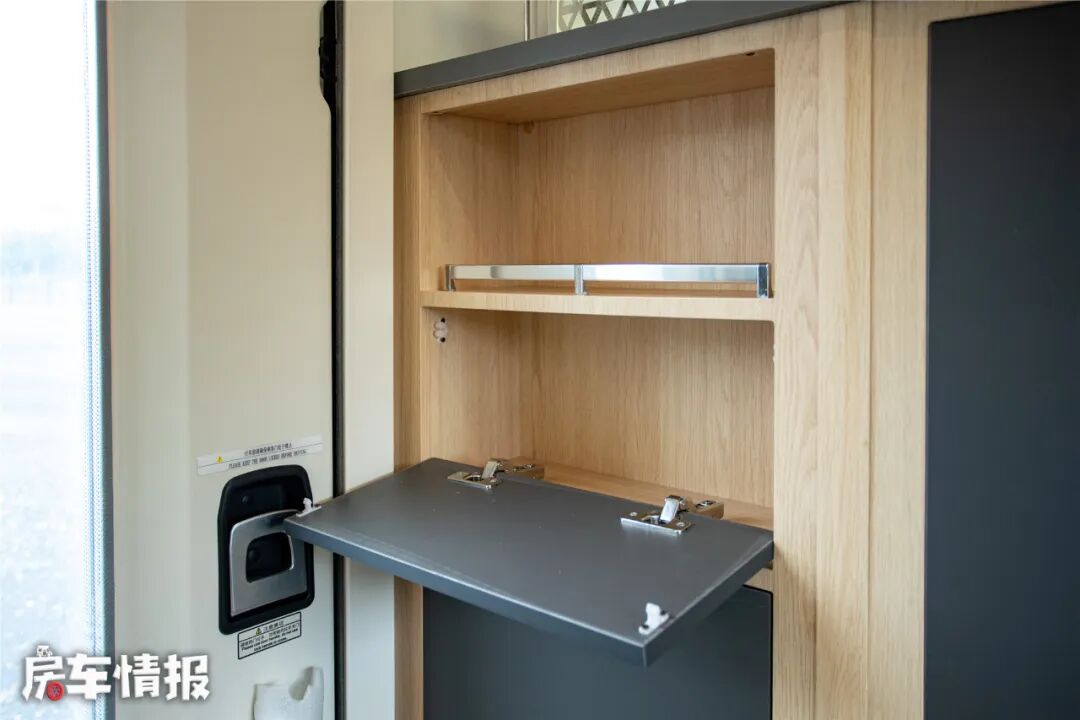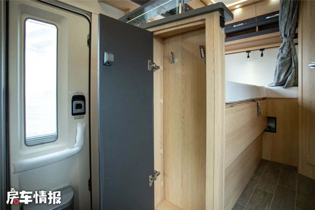 来到车厢后方区域,首先在中门处设置了一个玄关,作用有两个,第一个是在这里形成了小的分区作用,把后方的纵置床隔断在内侧,提供了一定的私密性;第二个则是玄关内部提供了储物柜、鞋柜以及一个小衣柜,可以在上下车的时候换鞋、取放外套。