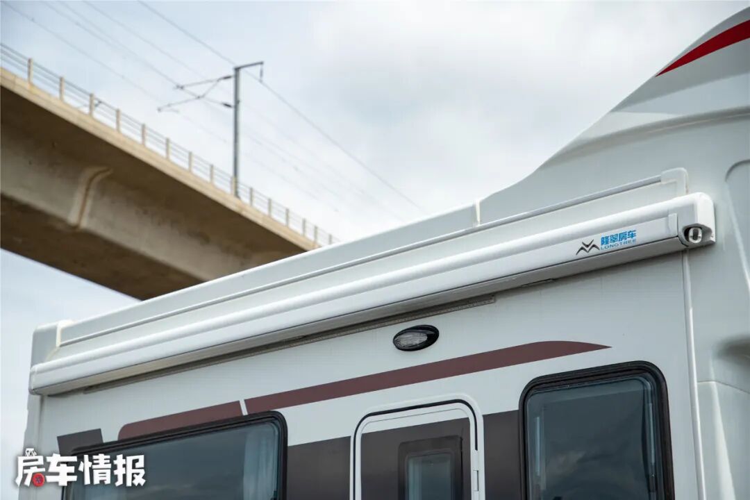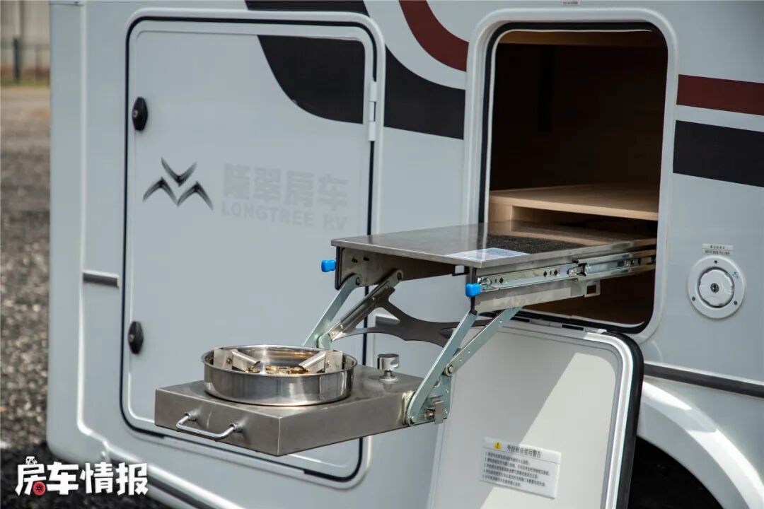 车身外部也加入了一些实用性设施,如车顶部的手动遮阳棚、外置抽拉燃气灶、独立燃气罐储藏箱以及一个超大容积的外部行李箱,应对日常使用完全没有问题。