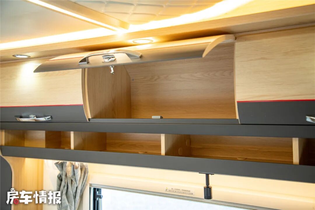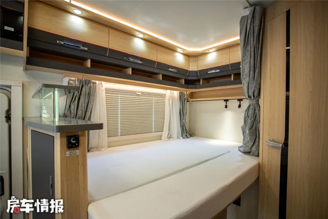 玄关内侧就是车内的另一个休息区,一张长度在1850mm,宽度最宽1250mm的纵置双人床,为了,提升外部通道的宽度,床铺的外侧是可以翻折的,收起来以后宽度会变成950mm。