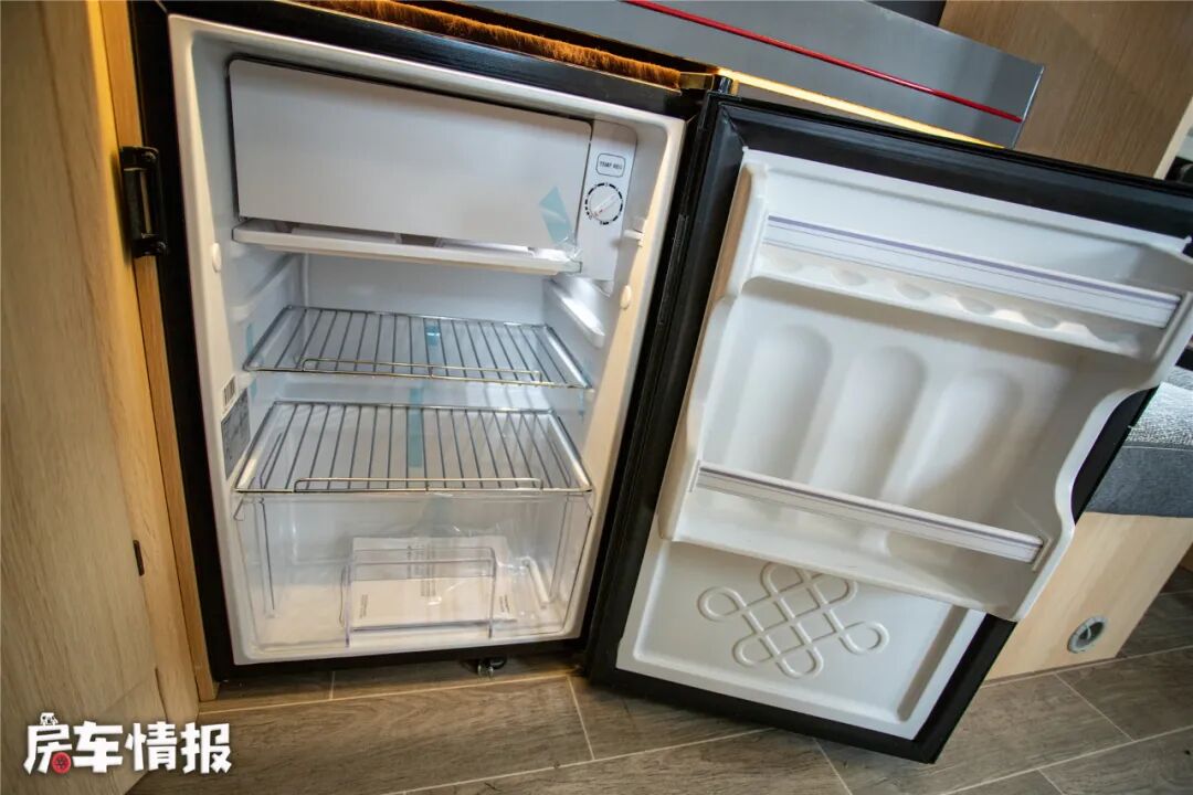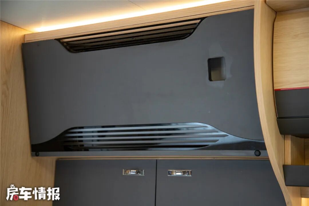 位于洗手池西方还提供了一台88L的房车专用冰箱,日常可以把食材存放在里边。上方则提供了一台家用变频空调。