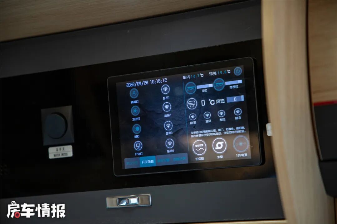 中门上方是车内的触摸式控制屏,C620系列升级了车内的智能控制系统,除了采用这块全新定制UI的屏幕控制外,还可以使用手机互联、语音等形式控制和查看车内水电使用情况。