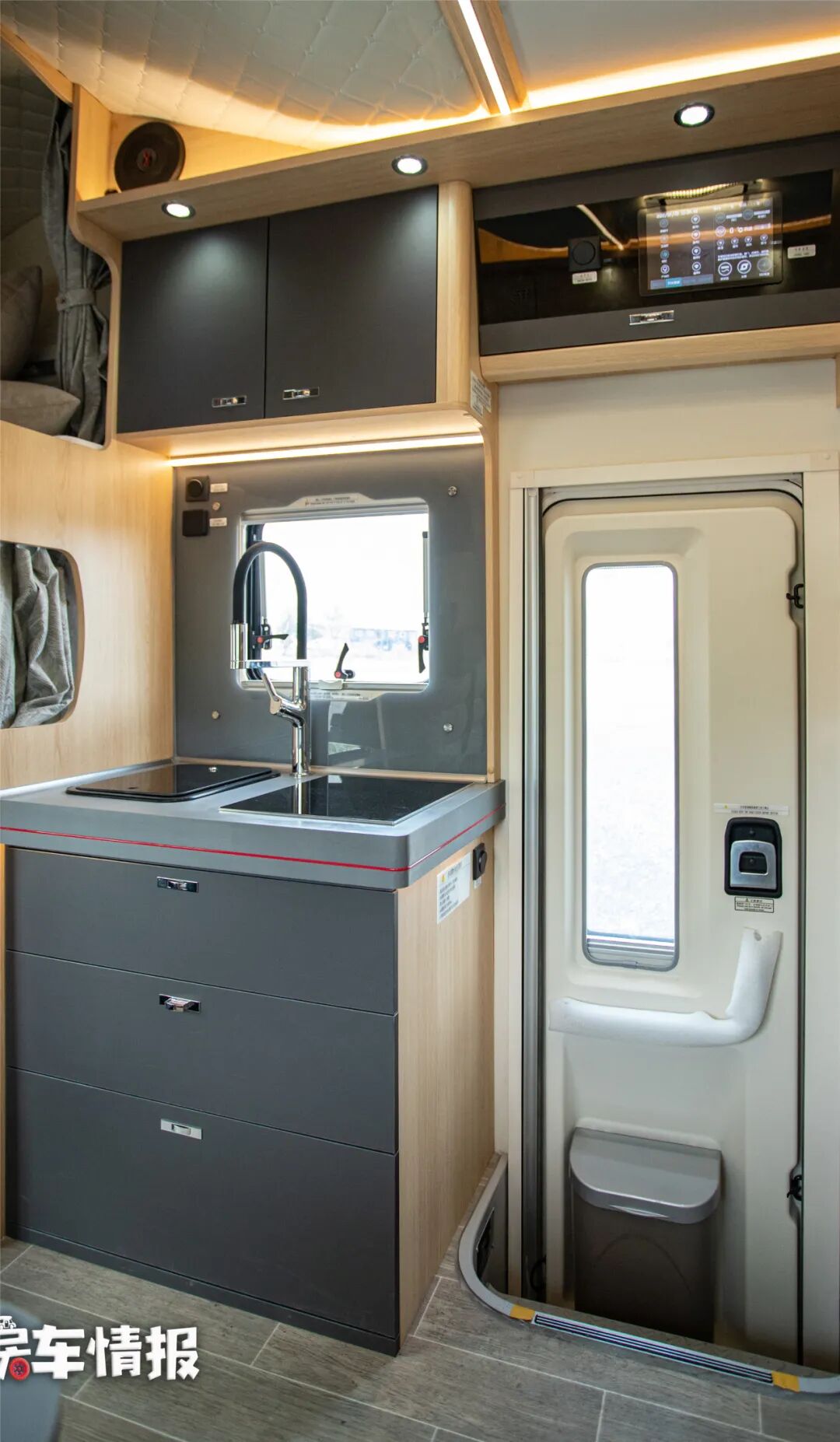 位于中门一侧,则是设置了一组整体式厨房,这提供储物抽屉、洗菜池、1200W电磁炉、水龙头等设备,基本上可以满足日常使用。