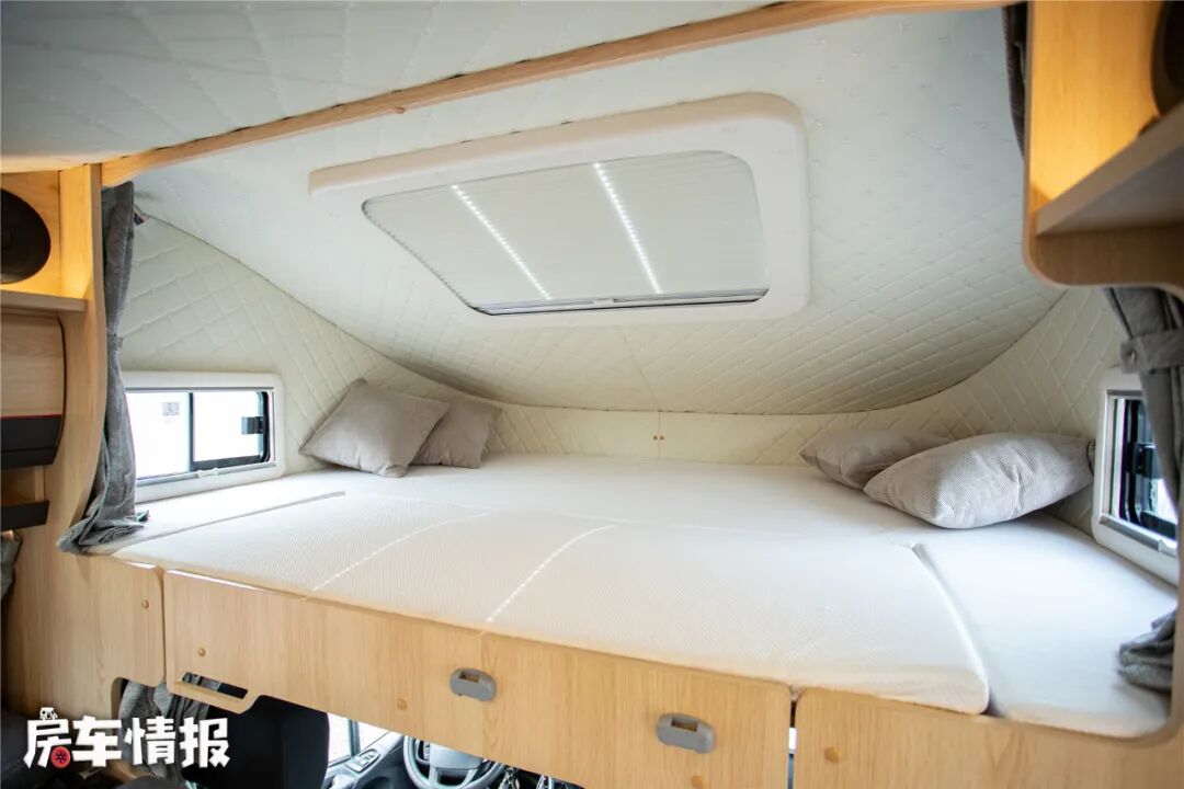 我把车内生活区大致分为三个部分,最前方的额头床、中部独立会客区以及尾部的多功能区,咱们从前往后看,前方额头床尺寸约为2200*1600mm,尺寸还是挺大的,虽然内侧垂直高度有限,但睡下两名成年人依然没有问题。