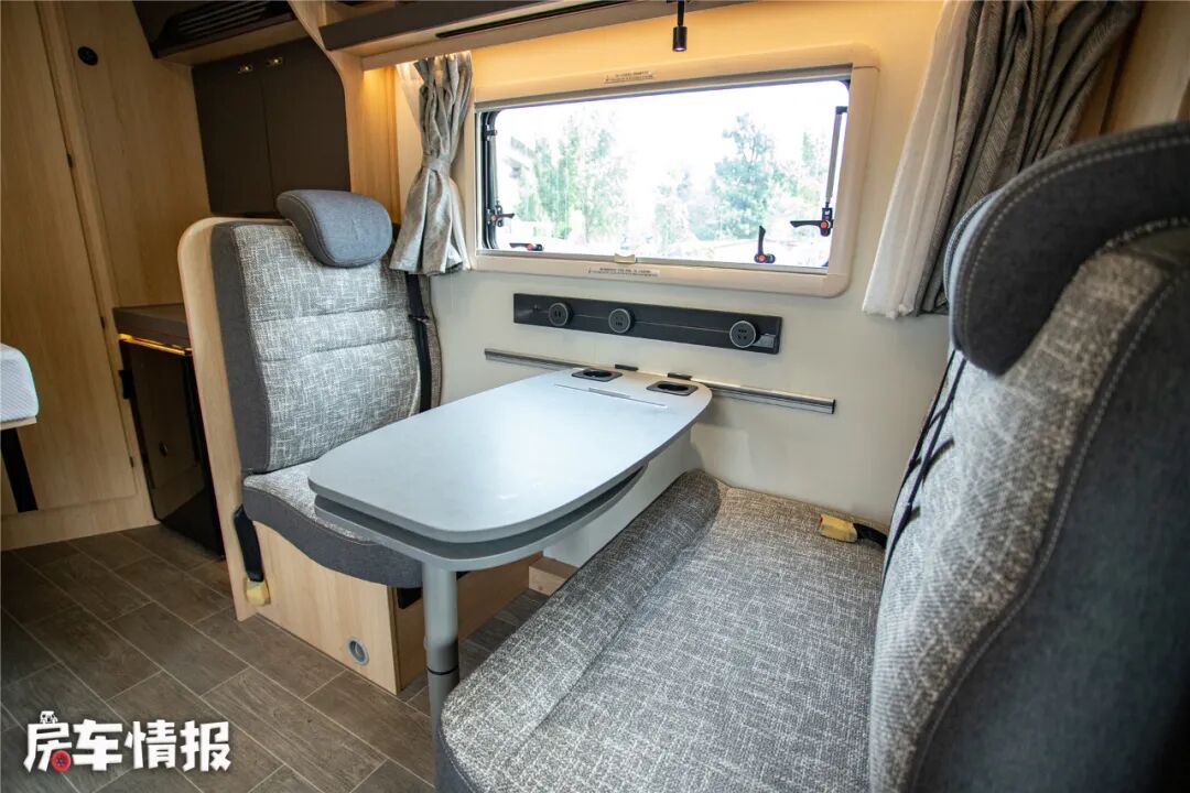 接下来车厢中部会客区,和常见的四人对卡座沙发不同,为了给车厢中部的通道预留出更多空间,这款车采用了一个1+2的三人对卡座,这样一来单人一侧的外部空间会更大,还有一个原因就是,即便是双人座椅,在这样的空间里,横向坐俩人也会有点挤,倒不如变成一个更宽敞的单人座椅,而另一侧的也乘坐一人,如此以来一家四口出行,每个人都能坐的不憋屈。