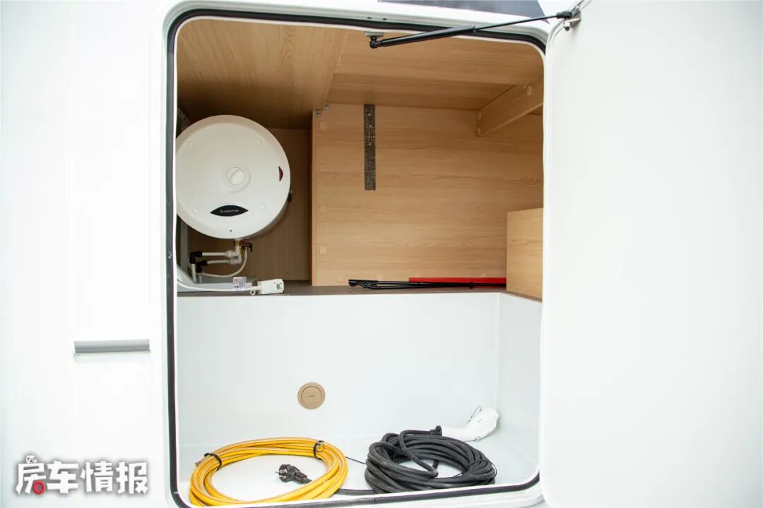 水电方面,这款车也非常的齐全,整车采用48V电路系统,提供了3000W逆变器、200Ah锂电池(约等于10度电)、500W太阳能电池板(最高可选1100W)、埃贝赫柴油暖风机+25L家用电热水器、以及300L食品级净水箱和70L灰水箱,基本上一家四口出行,可以做到水电无忧。