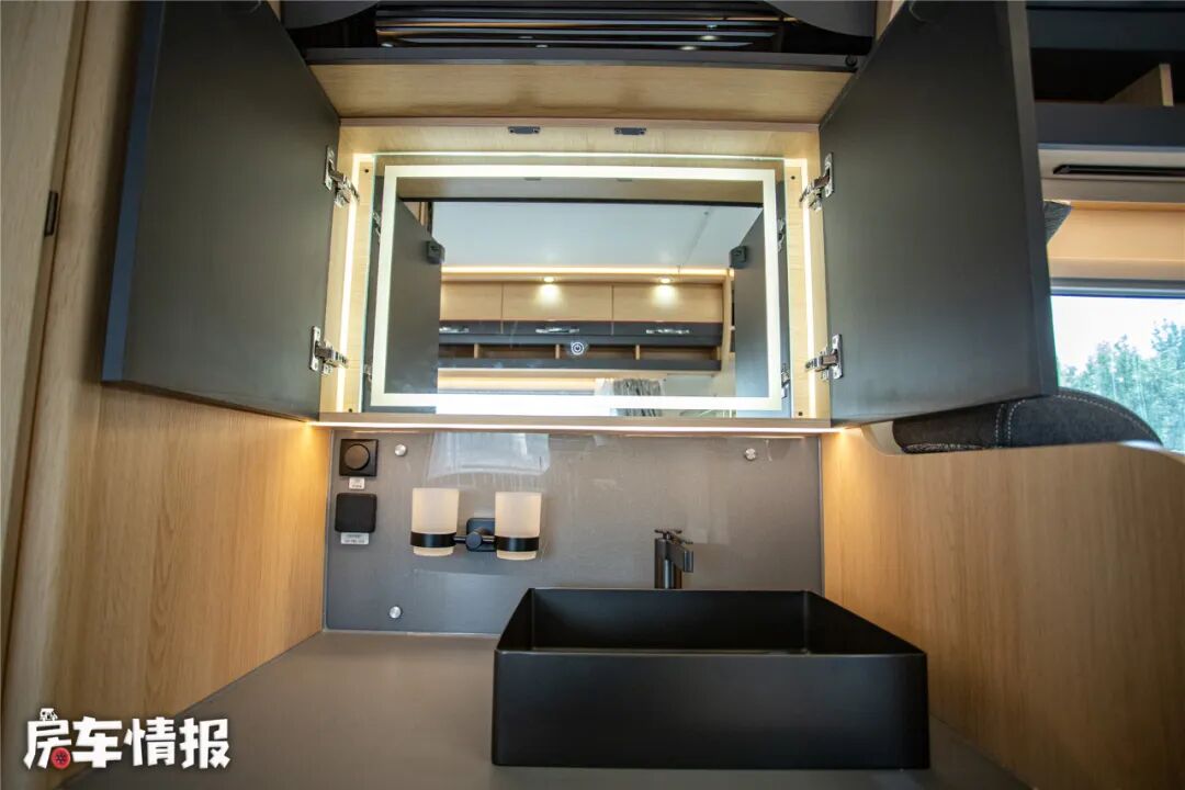 车内卫生间被分成了内外两个区域,外部的更像是一个梳妆台,提供了定制洗手池、储物柜,上方柜门内还隐藏着一面带LED补光灯的梳妆镜,这样的设计讨巧的。
