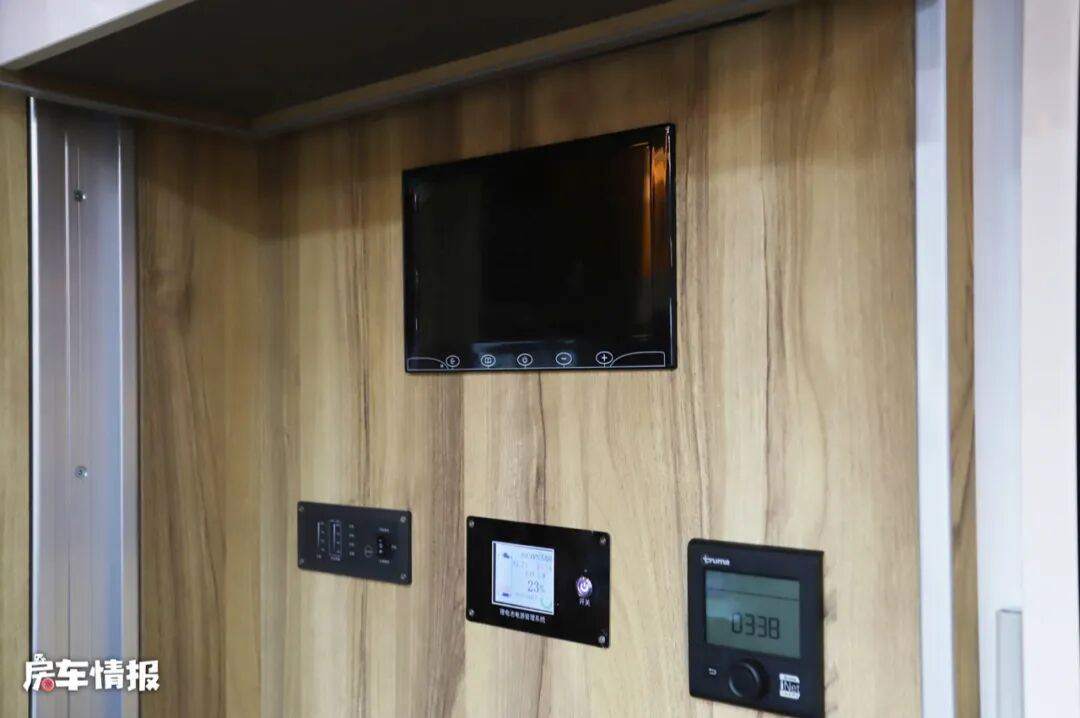 最后看一下水电方面,这款房车在电路上搭载了一台3000W的逆变器,并提供了1000Ah的锂电池,同时还配备了500W的太阳能,水路上则提供了200L的净水箱、70L的污水箱和17L的黑水箱,并搭载3M净水过滤系统,水电容量还是能够满足一家人使用的。