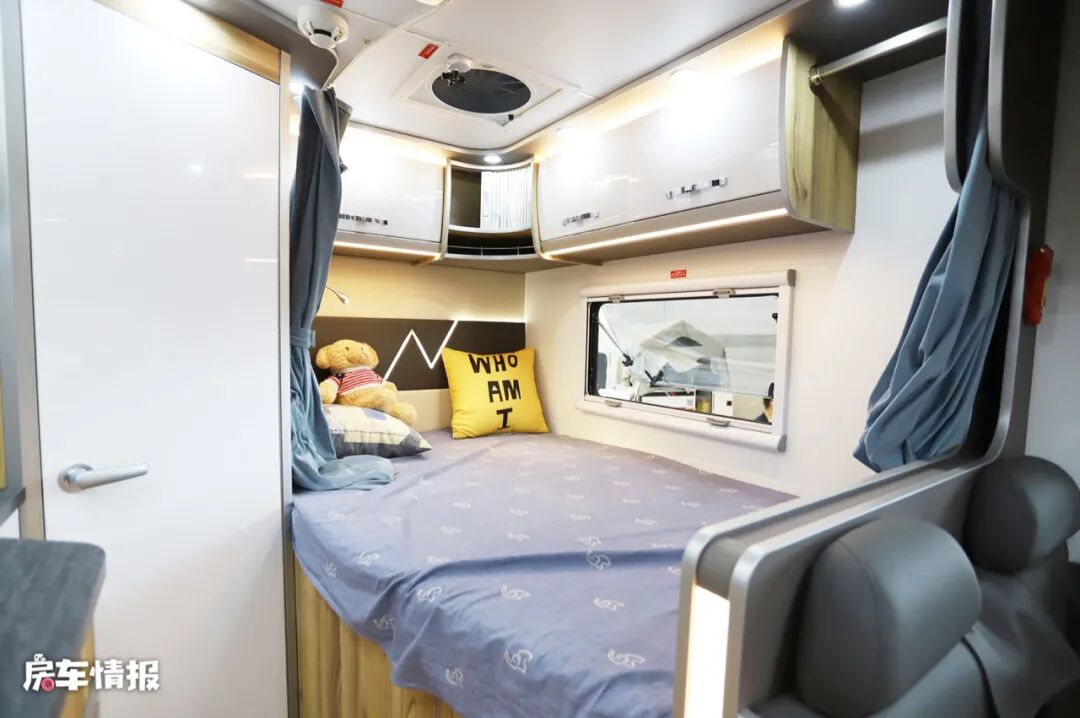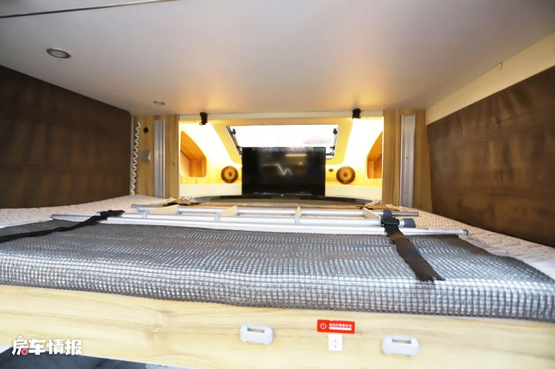 除去尾床之外,在前方会客区的顶部还有一张可升降的双人床,尺寸为2000mm*1400mm,平时也可以为两个成年人提供睡觉休息的地方,这张升降床还配有安全护栏和爬梯,保证乘客的安全。