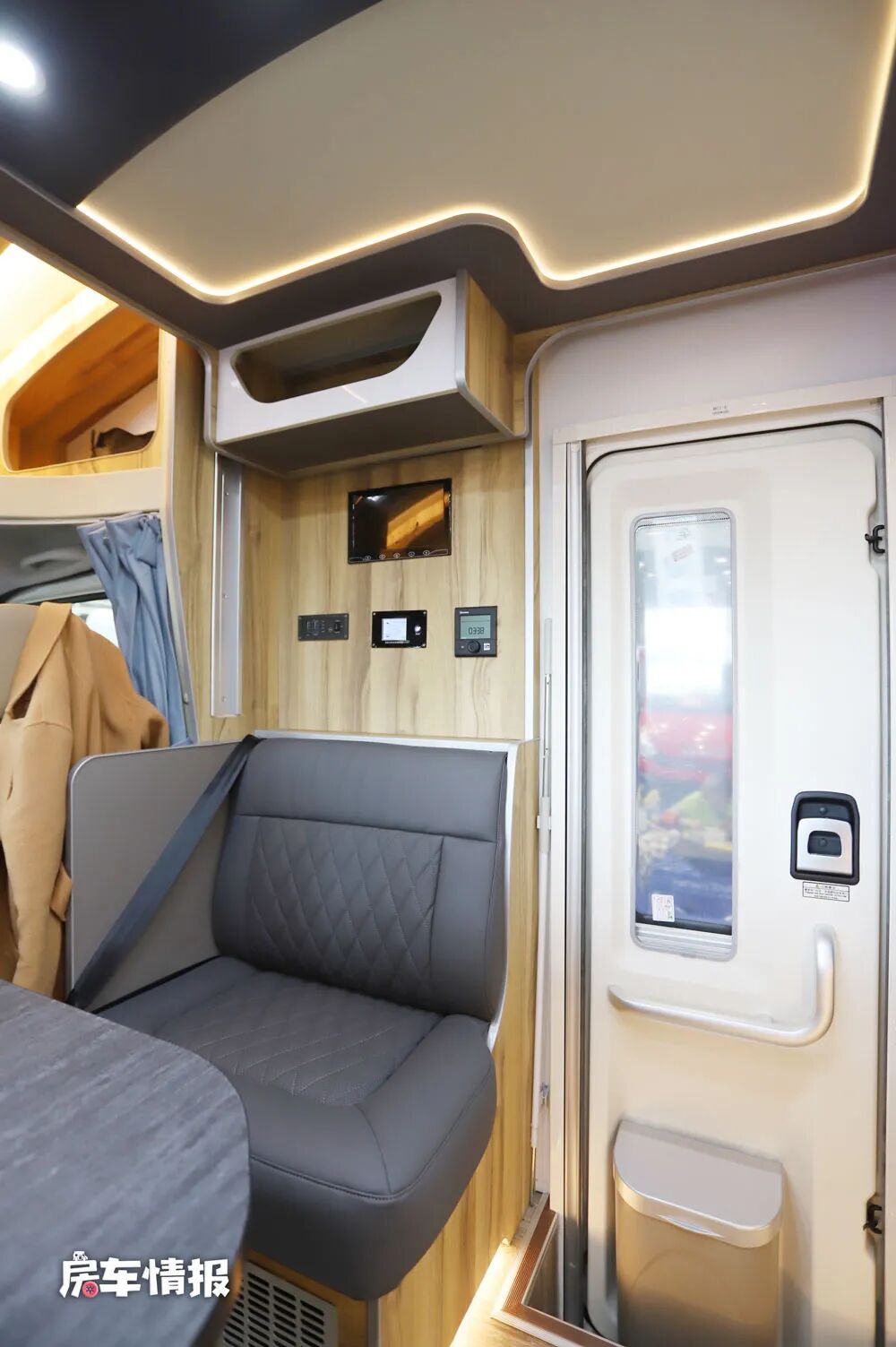 从车身右侧的乘客门进入车厢内部,整体感觉还是非常通透的,配色也非常的呼应前方的驾驶室,采用了大面积的米色和黑色。