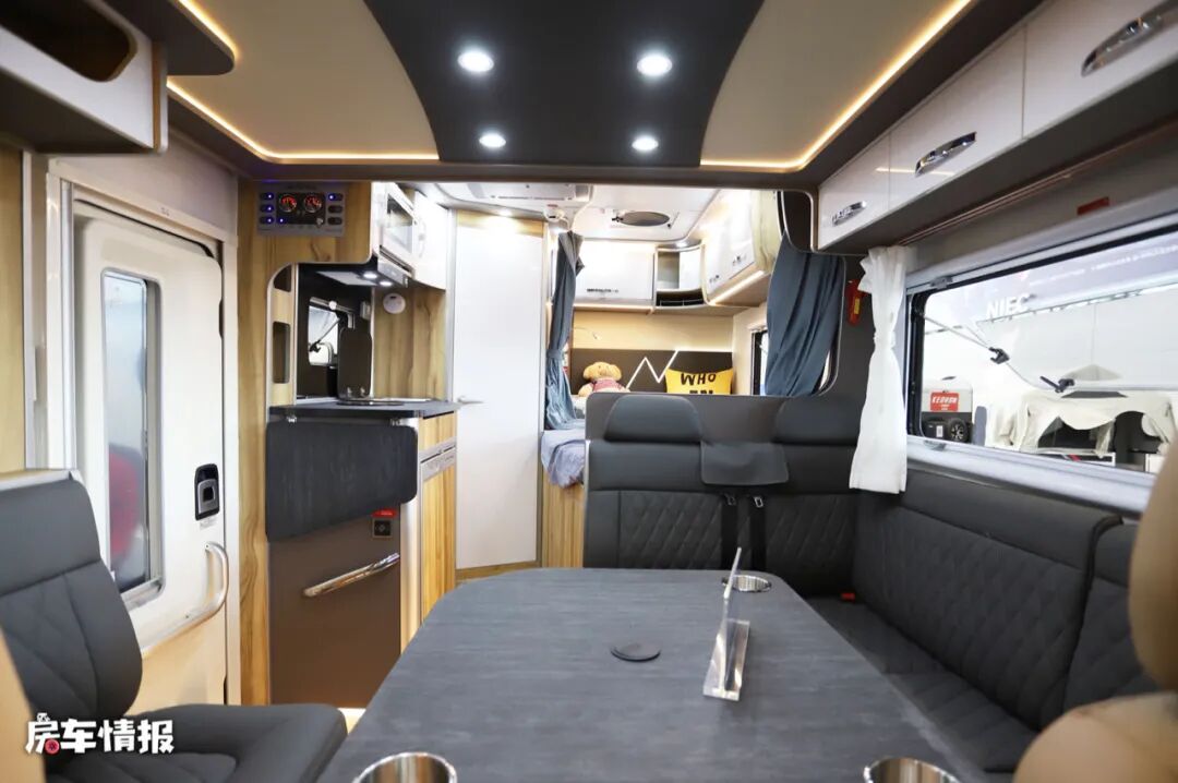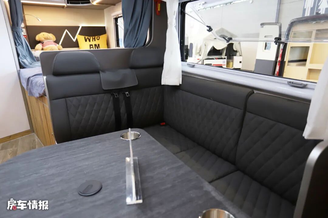 车厢前部的会客区内,采用的是L型沙发+单人座椅的布局方式,中间还提供了一张大尺寸的升降餐桌,黑色的沙发座椅非常有质感。
