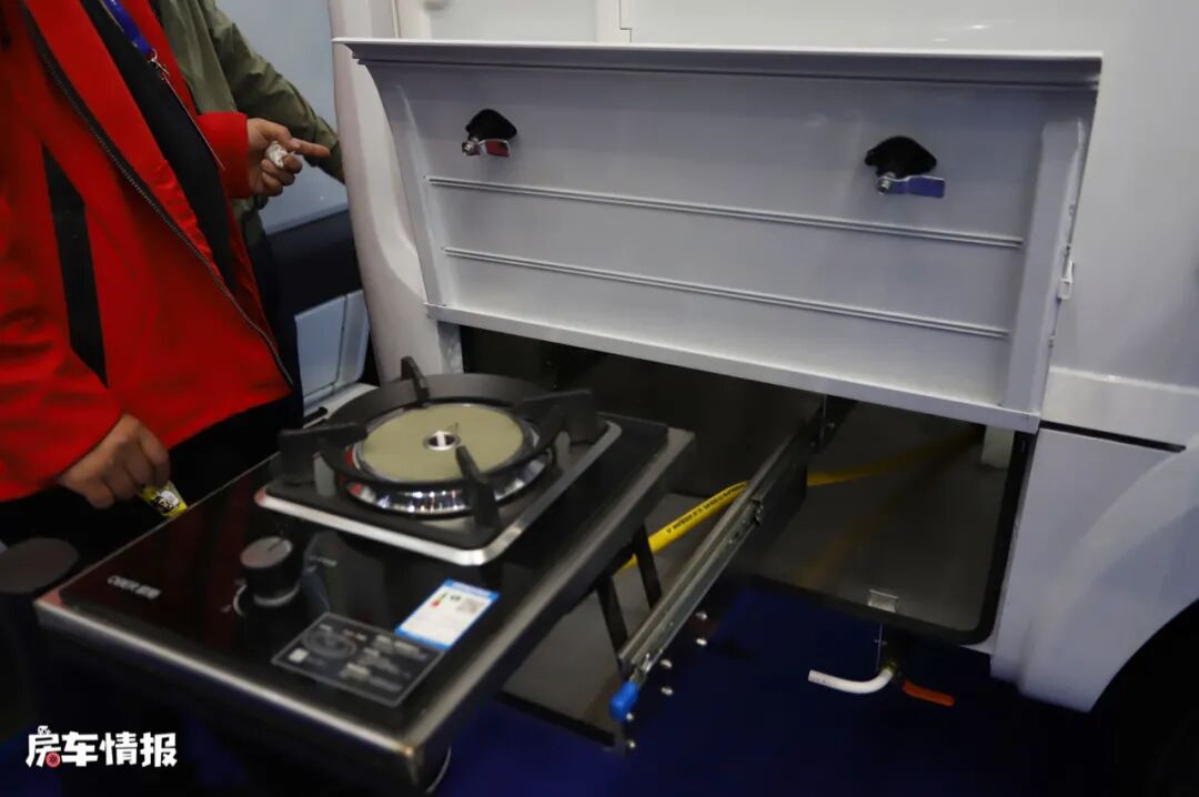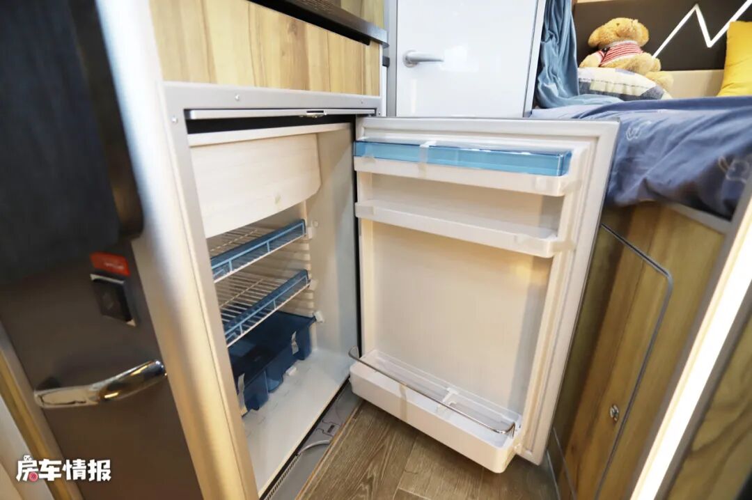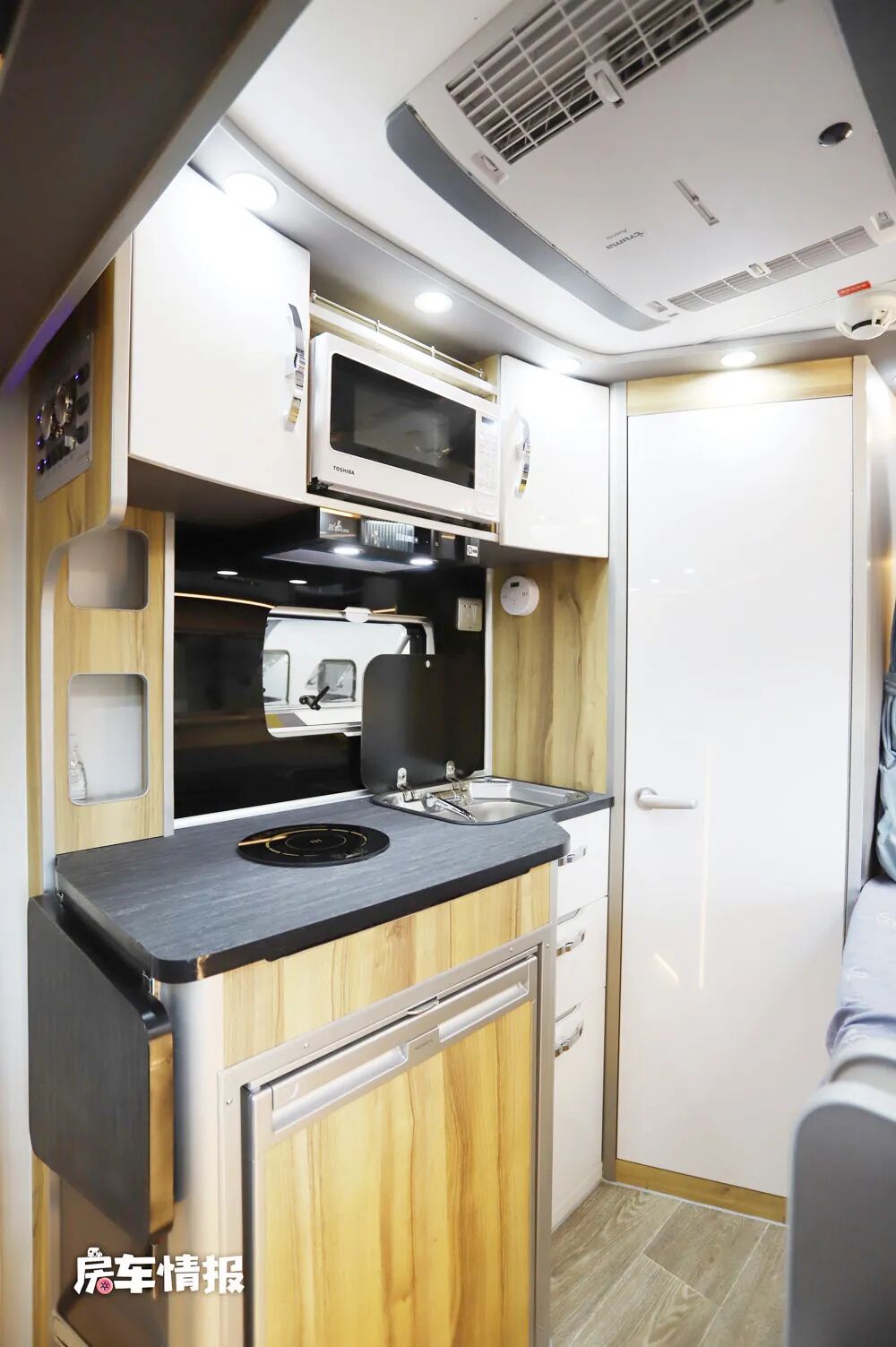 台面下方镶嵌了一台110L的车载冰箱,上方则配备了抽油烟机和微波炉,除此之外,上下都提供了储物空间。