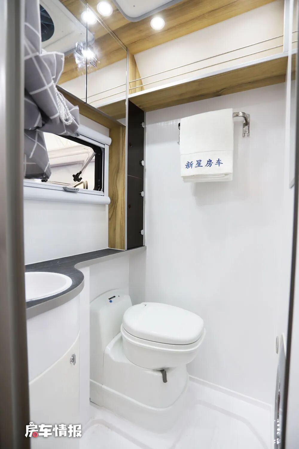 橱柜后方是一间单独的卫浴室,内部的配置也比较齐全,空间也很宽敞,提供了马桶、洗手池、毛巾杆、淋浴花洒、梳妆镜和储物吊柜等设施,完全可以满足出行洗漱的需求。