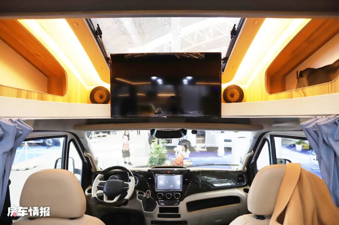 在前方驾驶室的上方额头区域内,打造了一个小型的影音室,不仅提供了一台32寸的网络电视,还搭配了超强的音响系统,坐在会客区看电视放松的同时也能享受超强的影音效果。