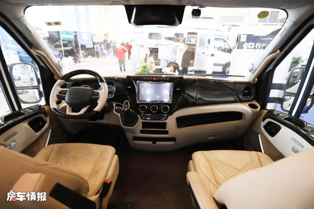 驾驶室相对于国产依维柯来说更加的精致细节,不仅提供了中控显示大屏和多功能方向盘,并采用了米色撞黑色的搭配,突出了高级感。