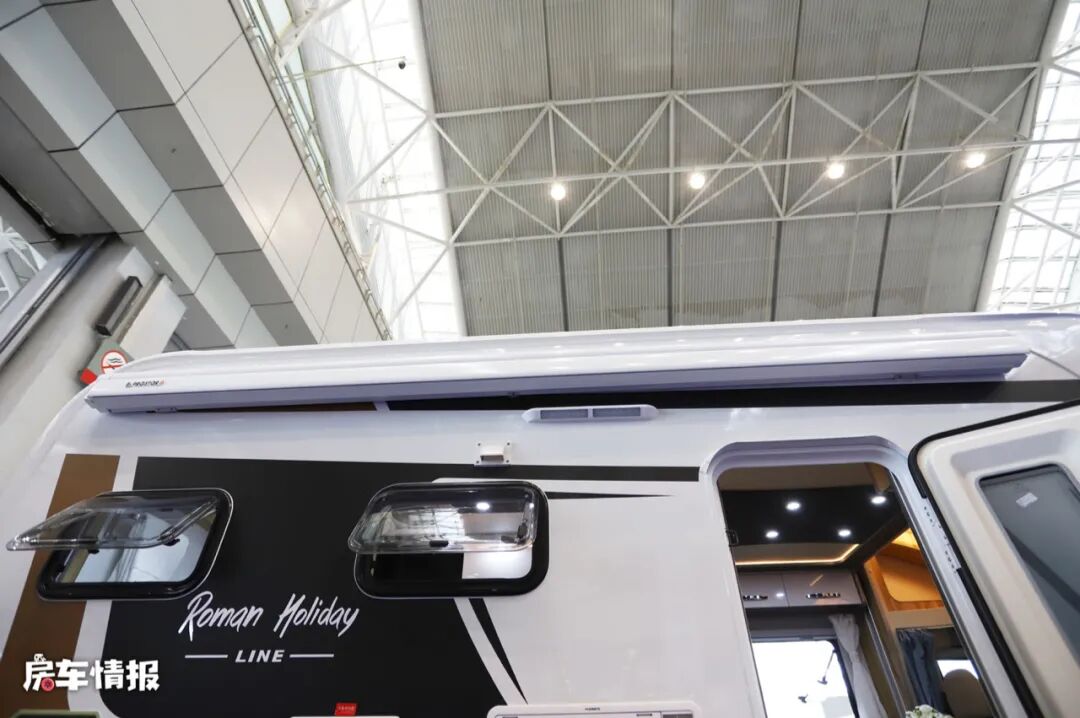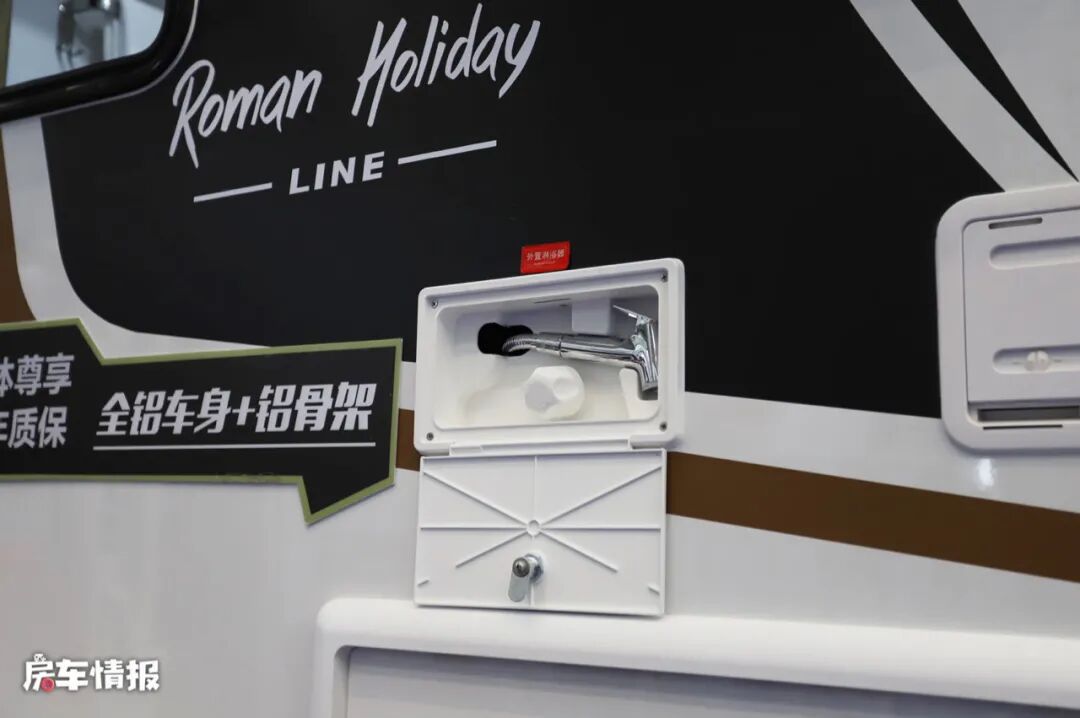 车身外部的配置也非常的丰富,包括了车尾部的大尺寸行李舱、车身右侧的手动遮阳棚、外置淋浴花洒、外置翻板、外置抽拉燃气灶以及水电接驳口等。既可以满足在车外开火做饭的需求,也可以随时为车辆进行补给。