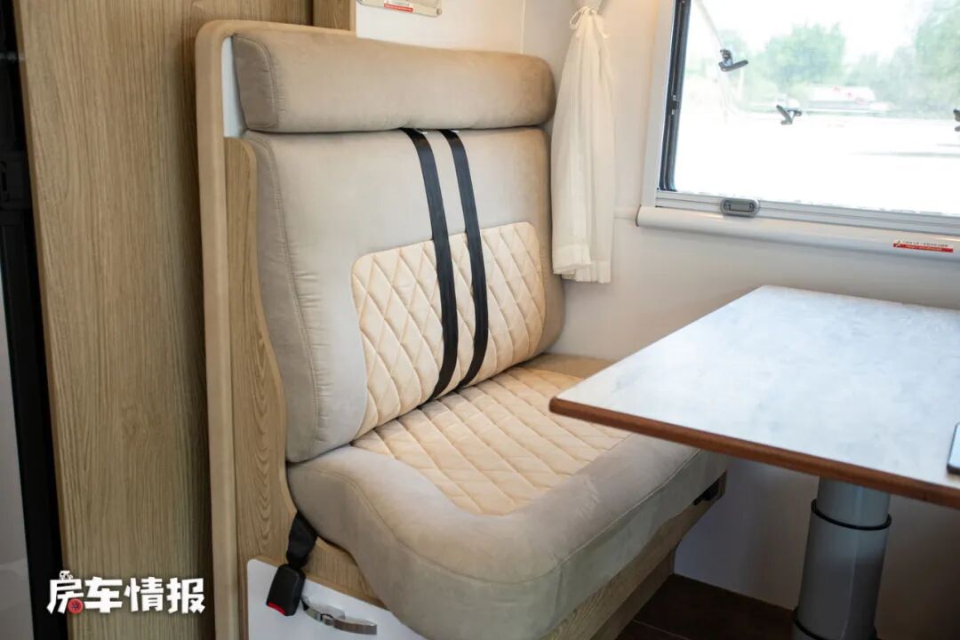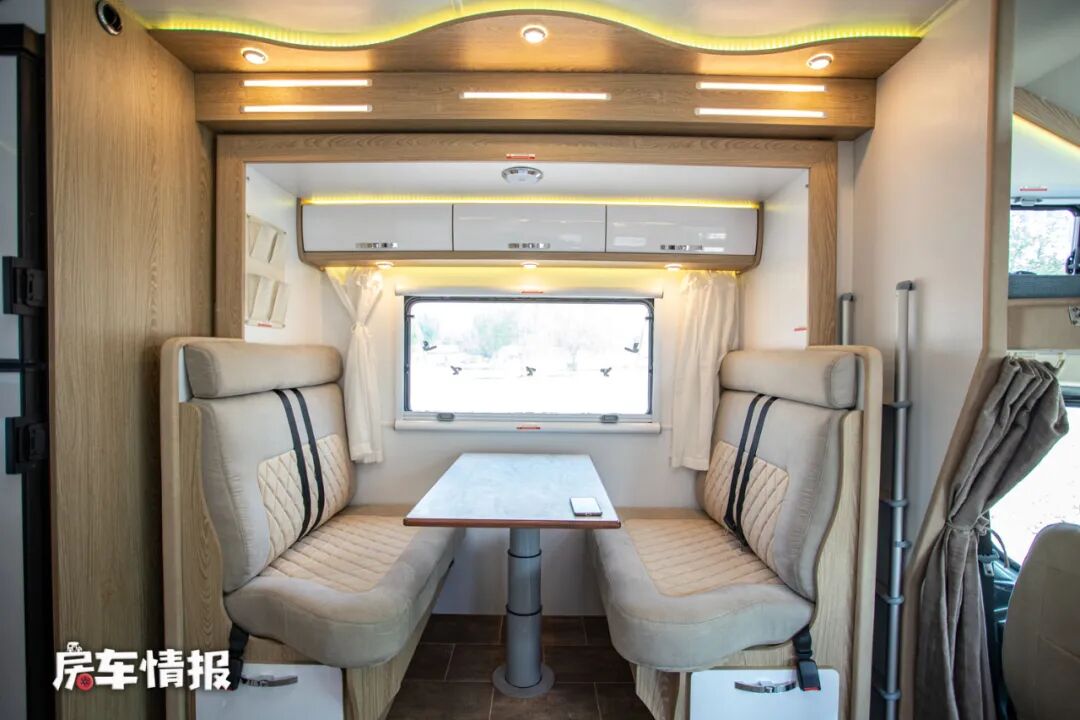 位于侧面拓展舱内的则是全车的会客就餐区域,采用经典的四人对卡座沙发+升降餐桌的设计,并配置了安全带,日常行车也可以乘坐,不过个人感觉如果后期能变成可以调节的乘用车座椅,会更加的舒适,配得上整辆车高端的定位,晚上会客区还能够变为一张1800*1000mm的单人沙发床。
