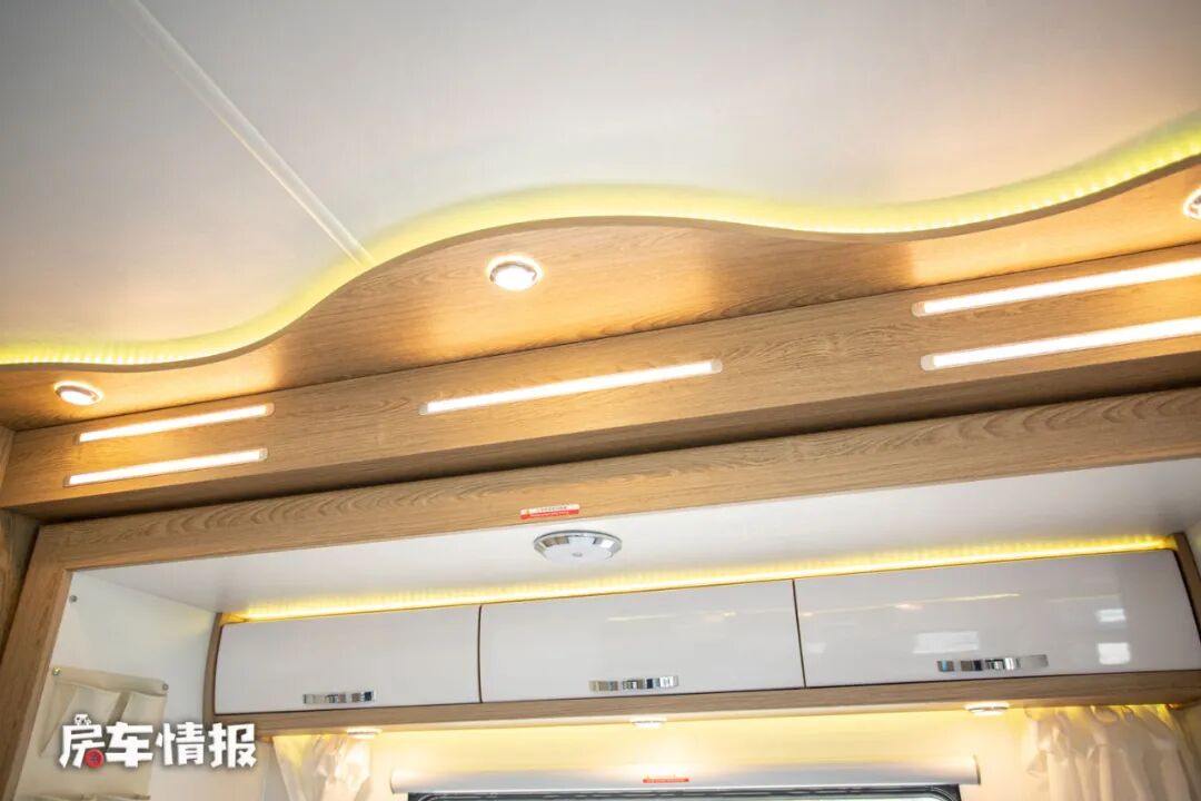 最前方驾驶室上方是额头休息区,采用三面环窗的设计,床铺尺寸为2200*1250mm。