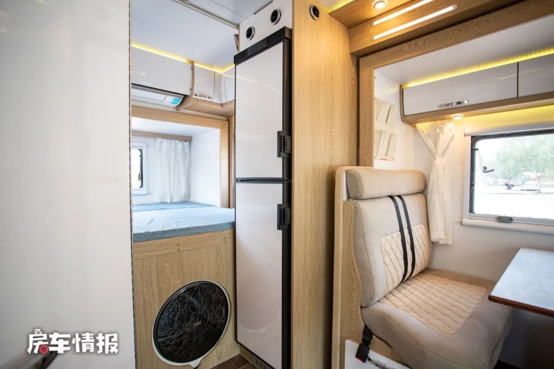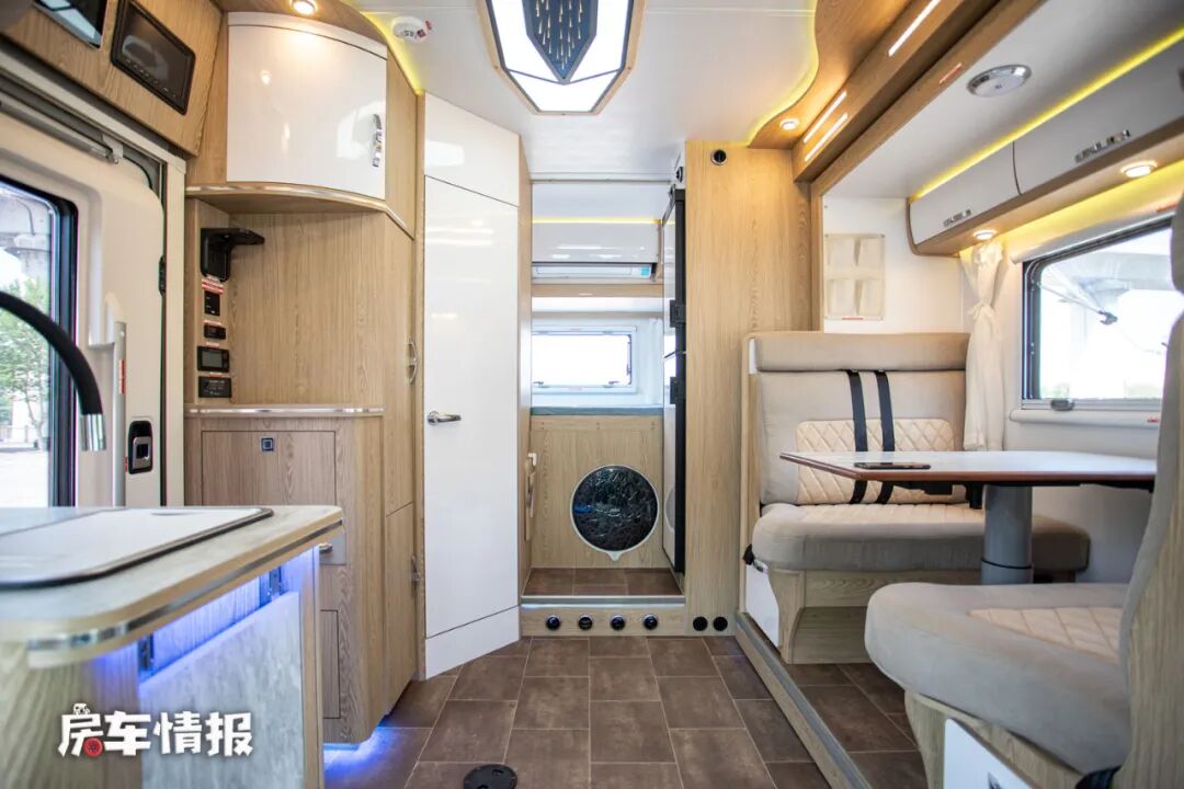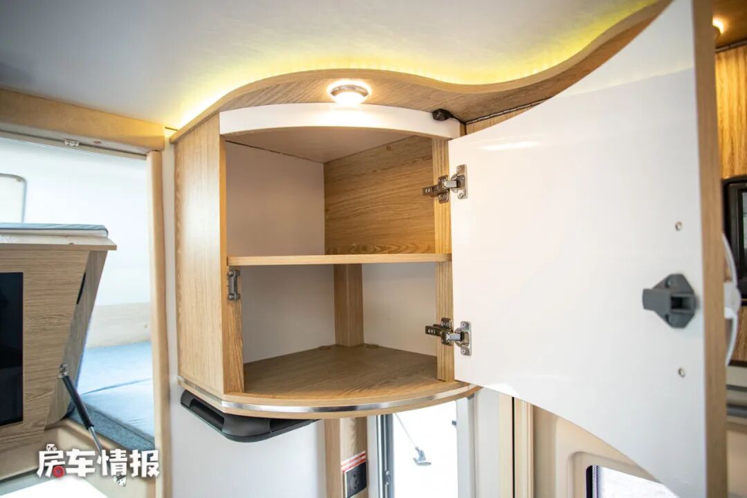 进入车厢内部,和我们之前介绍的中汽亿达房车所不同的是,采用了全新的田园配色风格,浅米色的家具也为内部带来了不错的通透性和空间感。